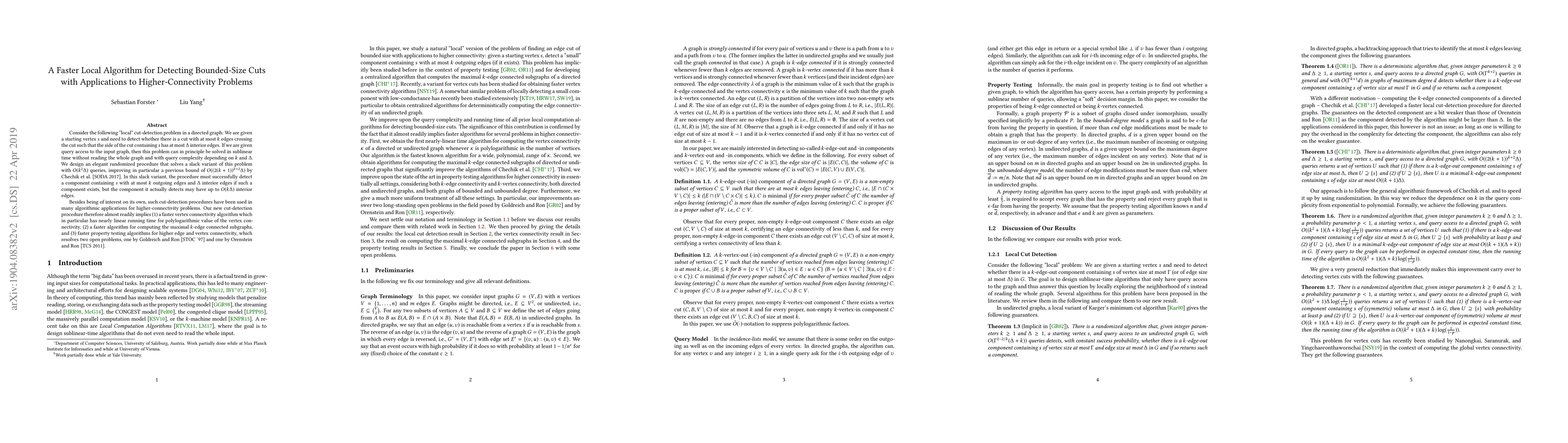 Consider the following "local" cut-detection problem in a directed graph: We are given a starting vertex $s$ and need to detect whether there is a cut with at most $k$ edges crossing the cut such that the side of the cut containing $s$ has at most $\Delta$ interior edges. If we are given query access to the input graph, then this problem can in principle be solved in sublinear time without reading the whole graph and with query complexity depending on $k$ and $\Delta$. We design an elegant randomized procedure that solves a slack variant of this problem with $O(k^2 \Delta)$ queries, improving in particular a previous bound of $O((2(k+1))^{k+2} \Delta)$ by Chechik et al. [SODA 2017]. In this slack variant, the procedure must successfully detect a component containing $s$ with at most $k$ outgoing edges and $\Delta$ interior edges if such a component exists, but the component it actually detects may have up to $O(k \Delta)$ interior edges. Besides being of interest on its own, such cut-detection procedures have been used in many algorithmic applications for higher-connectivity problems. Our new cut-detection procedure therefore almost readily implies (1) a faster vertex connectivity algorithm which in particular has nearly linear running time for polylogarithmic value of the vertex connectivity, (2) a faster algorithm for computing the maximal $k$-edge connected subgraphs, and (3) faster property testing algorithms for higher edge and vertex connectivity, which resolves two open problems, one by Goldreich and Ron [STOC '97] and one by Orenstein and Ron [TCS 2011].