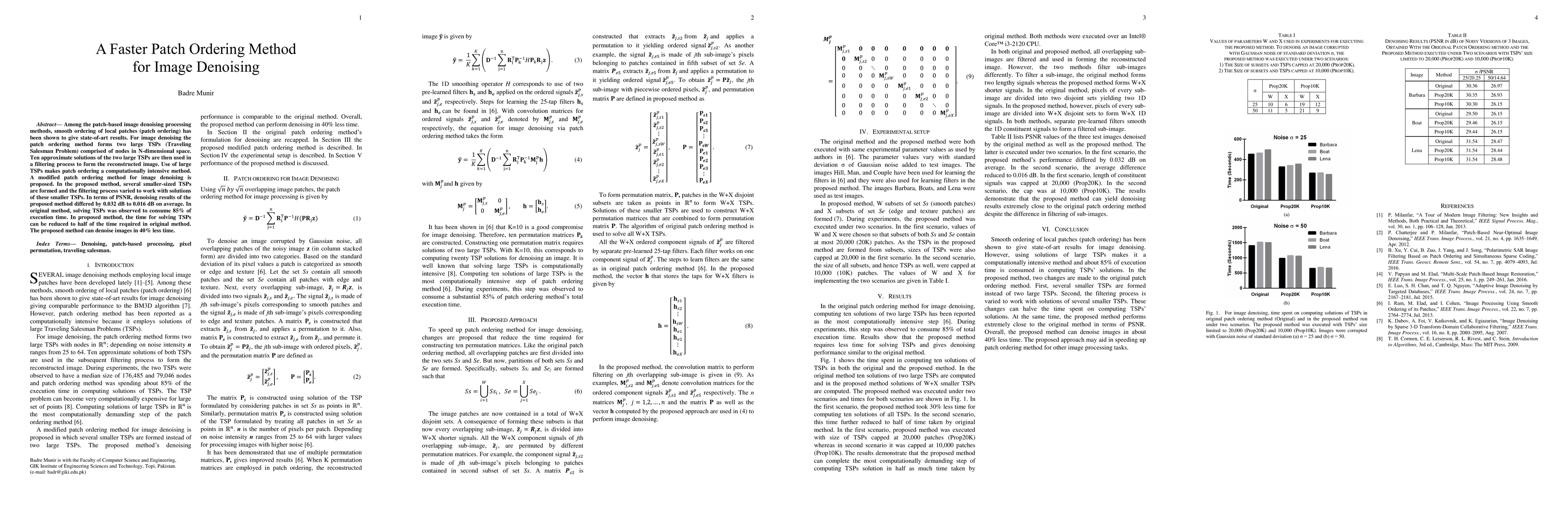 The paper proposes a faster patch ordering method for image denoising by replacing large TSPs with smaller ones, reducing TSP solving time by half and achieving a 40% decrease in overall denoising time, with minimal loss in denoising quality.