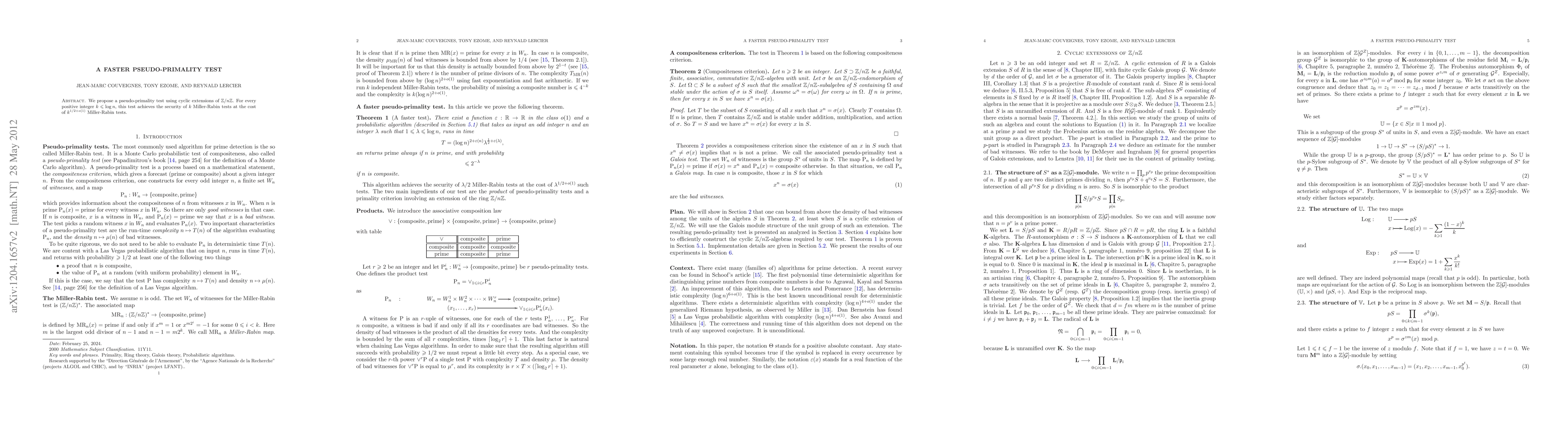 Summary: A new pseudo-primality test leverages cyclic extensions of $\mathbb Z/n \mathbb Z$ to achieve the security of $k$ Miller-Rabin tests using only $k^{1/2+o(1)}$ Miller-Rabin tests, thus offering a faster alternative.