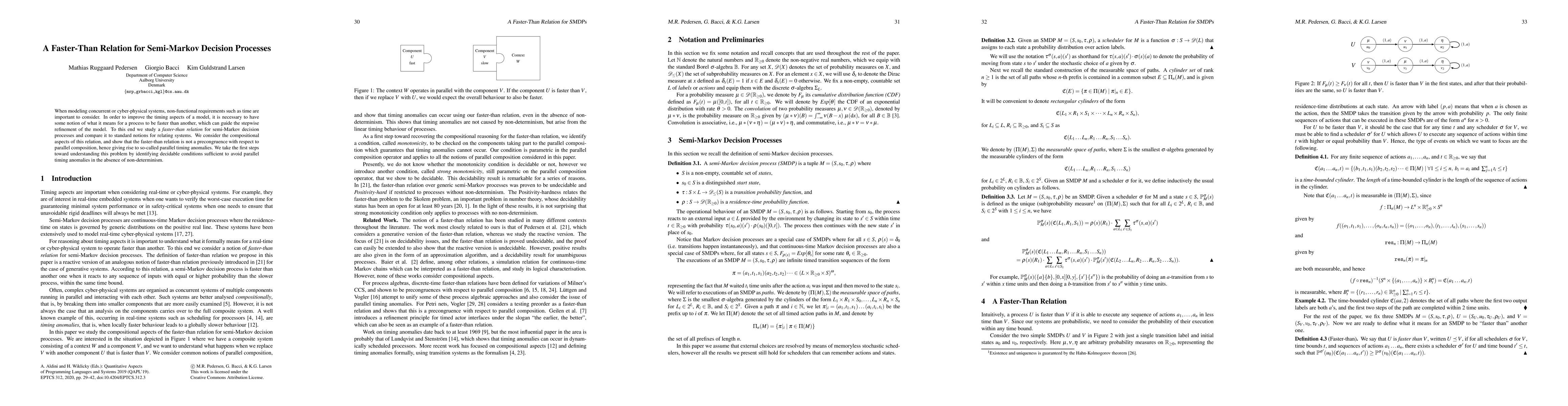 When modeling concurrent or cyber-physical systems, non-functional requirements such as time are important to consider. In order to improve the timing aspects of a model, it is necessary to have some notion of what it means for a process to be faster than another, which can guide the stepwise refinement of the model. To this end we study a faster-than relation for semi-Markov decision processes and compare it to standard notions for relating systems. We consider the compositional aspects of this relation, and show that the faster-than relation is not a precongruence with respect to parallel composition, hence giving rise to so-called parallel timing anomalies. We take the first steps toward understanding this problem by identifying decidable conditions sufficient to avoid parallel timing anomalies in the absence of non-determinism.
