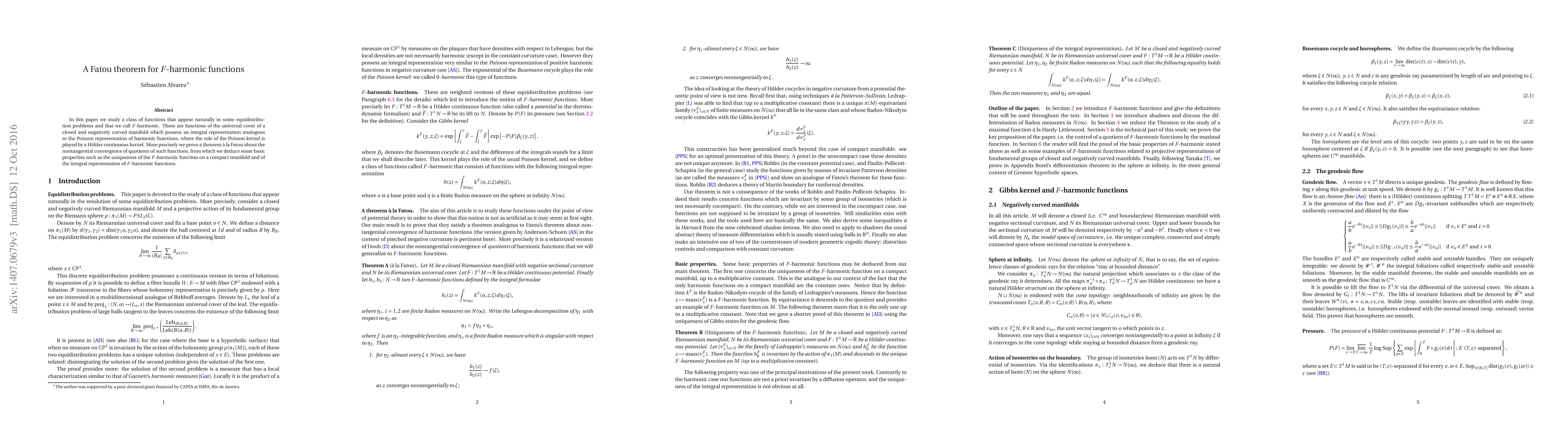 This paper introduces $F$-harmonic functions, a class linked to equidistribution problems, and proves a Fatou theorem for their nontangential convergence. The study also establishes the uniqueness of $F$-harmonic functions on compact manifolds and their integral representation.
