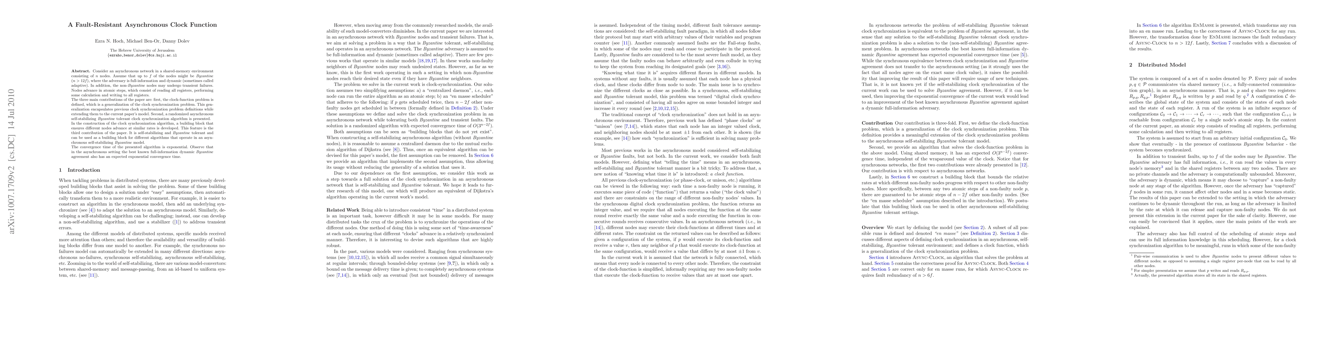 Consider an asynchronous network in a shared-memory environment consisting of n nodes. Assume that up to f of the nodes might be Byzantine (n > 12f), where the adversary is full-information and dynamic (sometimes called adaptive). In addition, the non-Byzantine nodes may undergo transient failures. Nodes advance in atomic steps, which consist of reading all registers, performing some calculation and writing to all registers. This paper contains three main contributions. First, the clock-function problem is defined, which is a generalization of the clock synchronization problem. This generalization encapsulates previous clock synchronization problem definitions while extending them to the current paper's model. Second, a randomized asynchronous self-stabilizing Byzantine tolerant clock synchronization algorithm is presented. In the construction of the clock synchronization algorithm, a building block that ensures different nodes advance at similar rates is developed. This feature is the third contribution of the paper. It is self-stabilizing and Byzantine tolerant and can be used as a building block for different algorithms that operate in an asynchronous self-stabilizing Byzantine model. The convergence time of the presented algorithm is exponential. Observe that in the asynchronous setting the best known full-information dynamic Byzantine agreement also has expected exponential convergence time, even though currently there is no known reduction between the two.