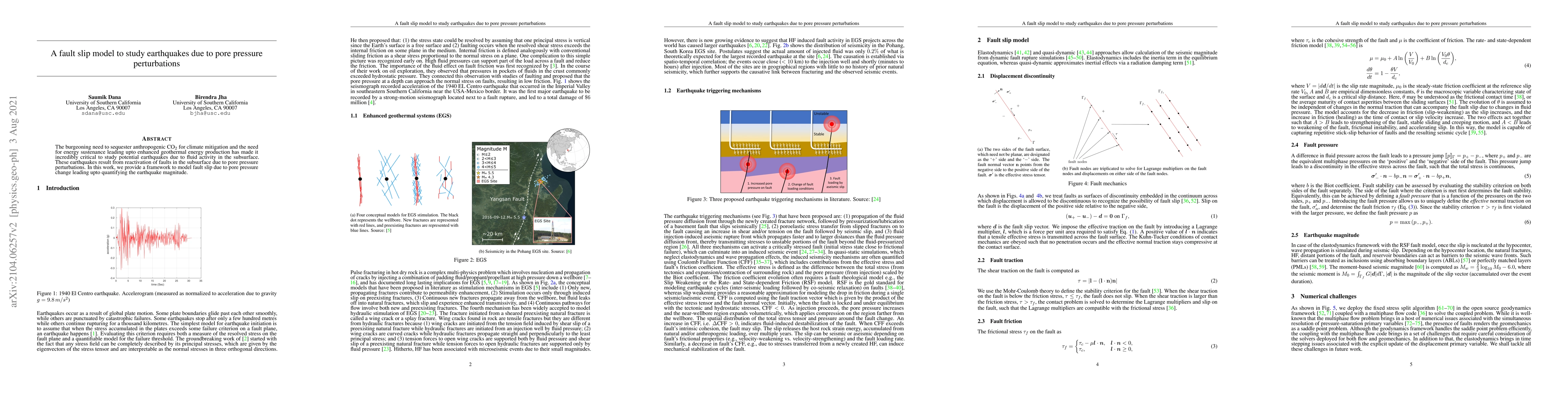 The burgeoning need to sequester anthropogenic CO$_2$ for climate mitigation and the need for energy sustenance leading upto enhanced geothermal energy production has made it incredibly critical to study potential earthquakes due to fluid activity in the subsurface. These earthquakes result from reactivation of faults in the subsurface due to pore pressure perturbations. In this work, we provide a framework to model fault slip due to pore pressure change leading upto quantifying the earthquake magnitude.