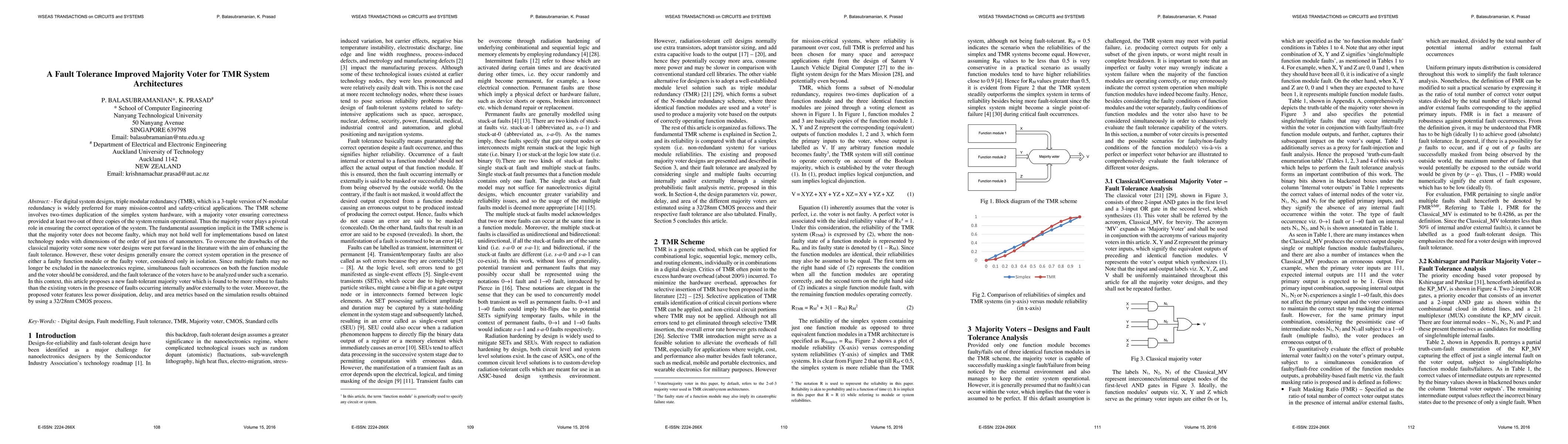 For digital system designs, triple modular redundancy (TMR), which is a 3-tuple version of N-modular redundancy is widely preferred for many mission-control and safety-critical applications. The TMR scheme involves two-times duplication of the simplex system hardware, with a majority voter ensuring correctness provided at least two out of three copies of the system remain operational. Thus the majority voter plays a pivotal role in ensuring the correct operation of the system. The fundamental assumption implicit in the TMR scheme is that the majority voter does not become faulty, which may not hold well for implementations based on latest technology nodes with dimensions of the order of just tens of nanometers. To overcome the drawbacks of the classical majority voter some new voter designs were put forward in the literature with the aim of enhancing the fault tolerance. However, these voter designs generally ensure the correct system operation in the presence of either a faulty function module or the faulty voter, considered only in isolation. Since multiple faults may no longer be excluded in the nanoelectronics regime, simultaneous fault occurrences on both the function module and the voter should be considered, and the fault tolerance of the voters have to be analyzed under such a scenario. In this context, this article proposes a new fault-tolerant majority voter which is found to be more robust to faults than the existing voters in the presence of faults occurring internally and/or externally to the voter. Moreover, the proposed voter features less power dissipation, delay, and area metrics based on the simulation results obtained by using a 32/28nm CMOS process.