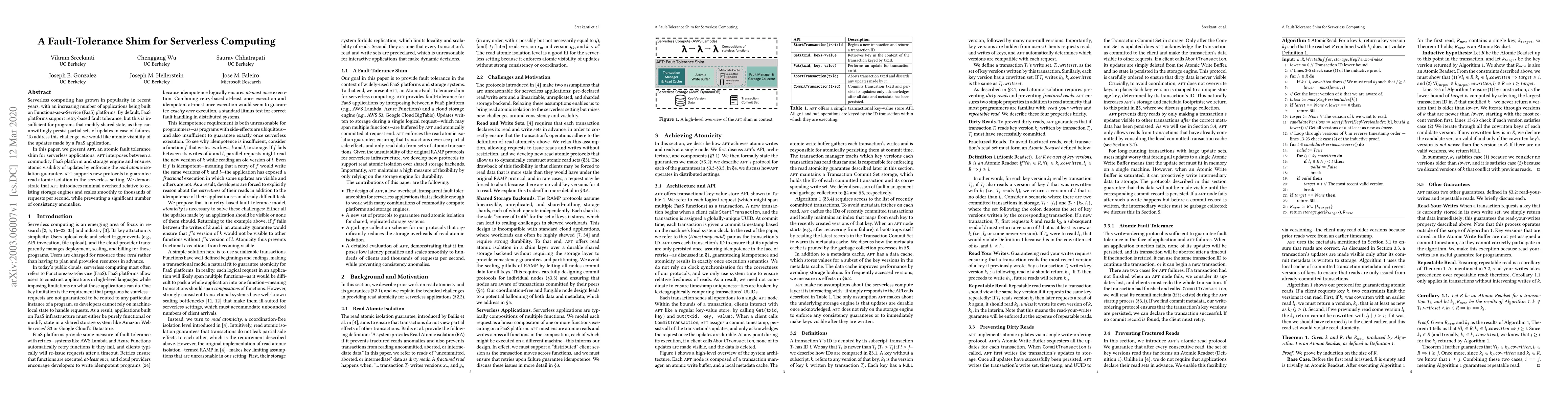 This paper introduces AFT, an atomic fault tolerance shim for serverless computing, which ensures atomic visibility of updates by enforcing read atomic isolation. AFT interposes between FaaS platforms and storage engines, introducing minimal overhead while preventing consistency anomalies and scaling efficiently.