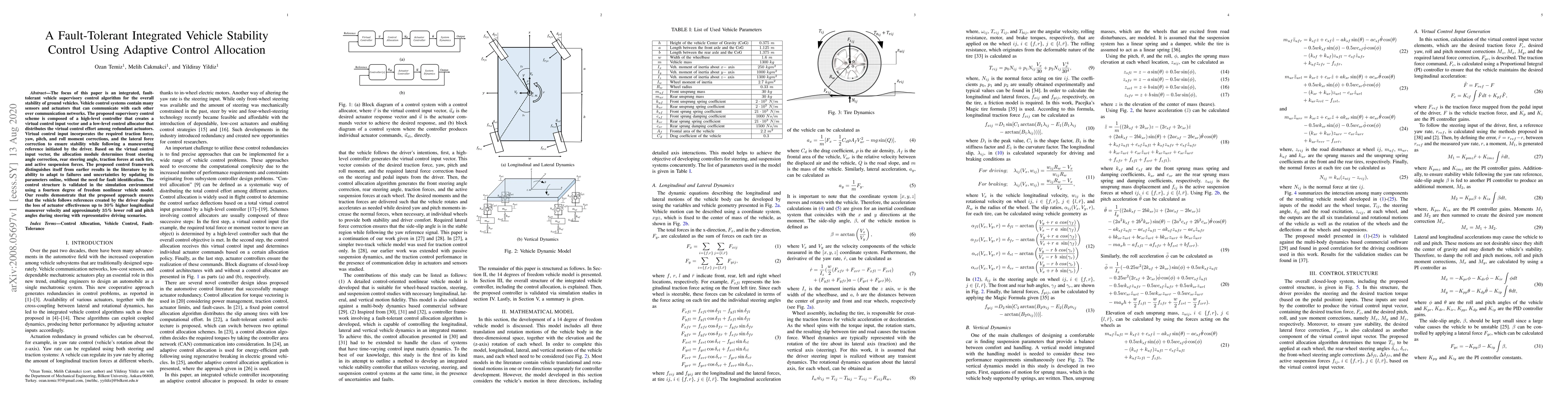 This paper proposes an integrated, fault-tolerant vehicle stability control algorithm using adaptive control allocation, which can adapt to actuator failures and uncertainties without fault identification. The control framework ensures vehicle stability and maneuverability despite up to 30% loss of actuator effectiveness.