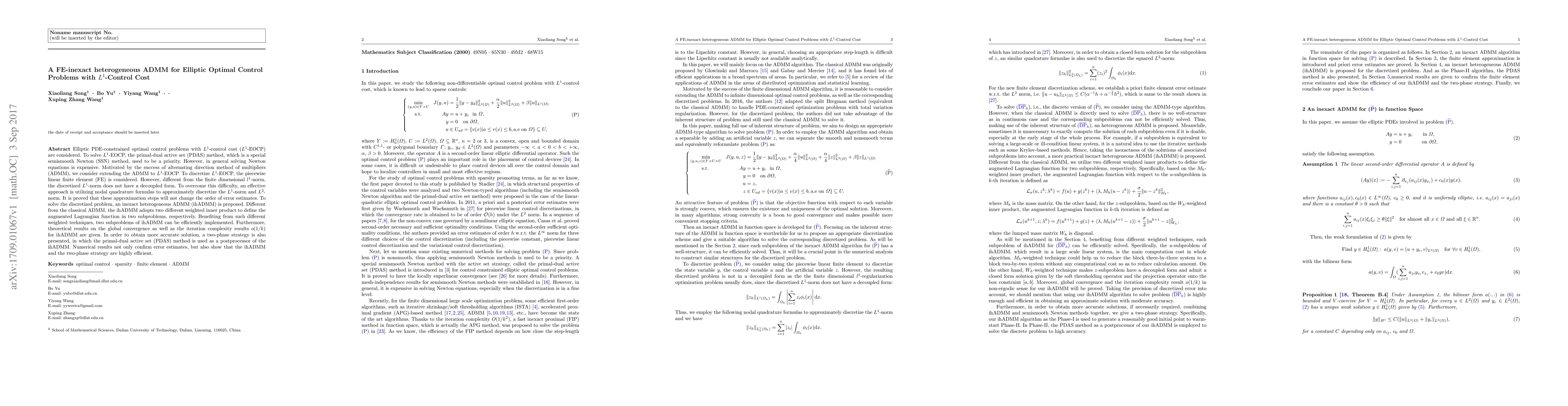 This research introduces an inexact heterogeneous ADMM (ihADMM) for solving Elliptic PDE-constrained optimal control problems with L1-control cost. The method efficiently tackles the discretization challenge of L1-norm by using nodal quadrature formulas, preserving error estimates. IhADMM, employing different weighted inner products, outperforms classical ADMM in subproblem implementation. Theoretical convergence guarantees and iteration complexity are provided, along with a two-phase strategy using PDAS for enhanced accuracy. Numerical results validate the approach's efficiency.
