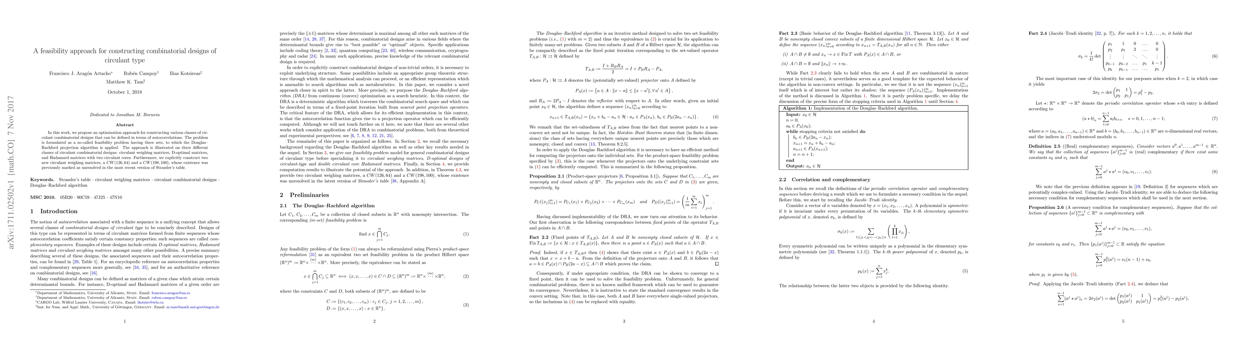 This paper proposes an optimization approach to construct circulant combinatorial designs, employing the Douglas-Rachford projection algorithm for feasibility. It successfully constructs new circulant weighing matrices, resolving previous existence uncertainties.