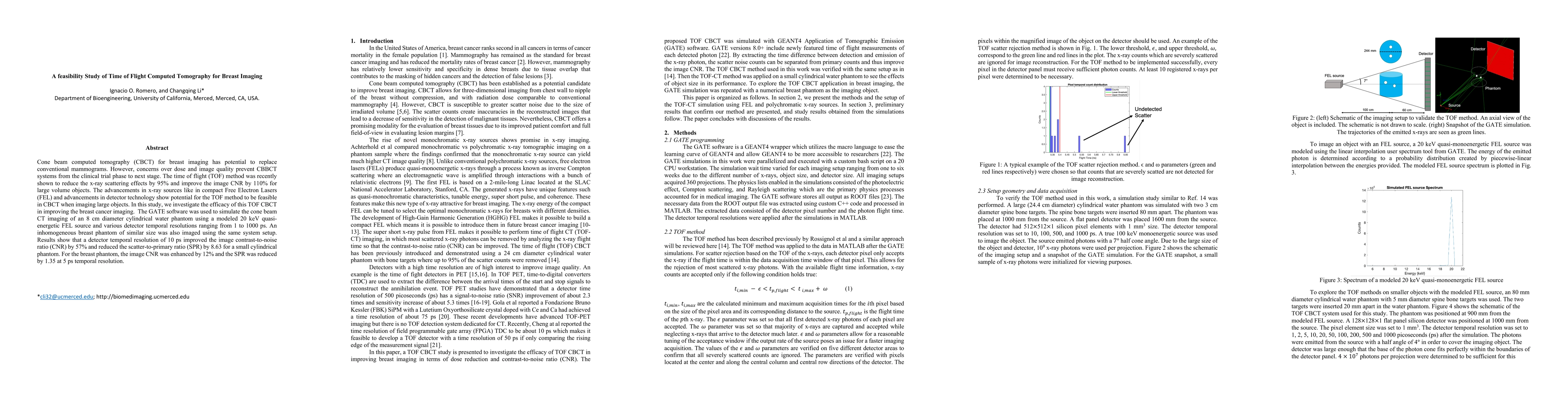 This study evaluates the feasibility of time-of-flight (TOF) cone beam computed tomography (CBCT) for breast imaging, showing significant improvements in image contrast-to-noise ratio and reductions in scatter-to-primary ratio, suggesting its potential to enhance breast cancer detection. Simulations using GATE software and a quasi-energetic FEL source indicate optimal performance at temporal resolutions of 5-10 ps.