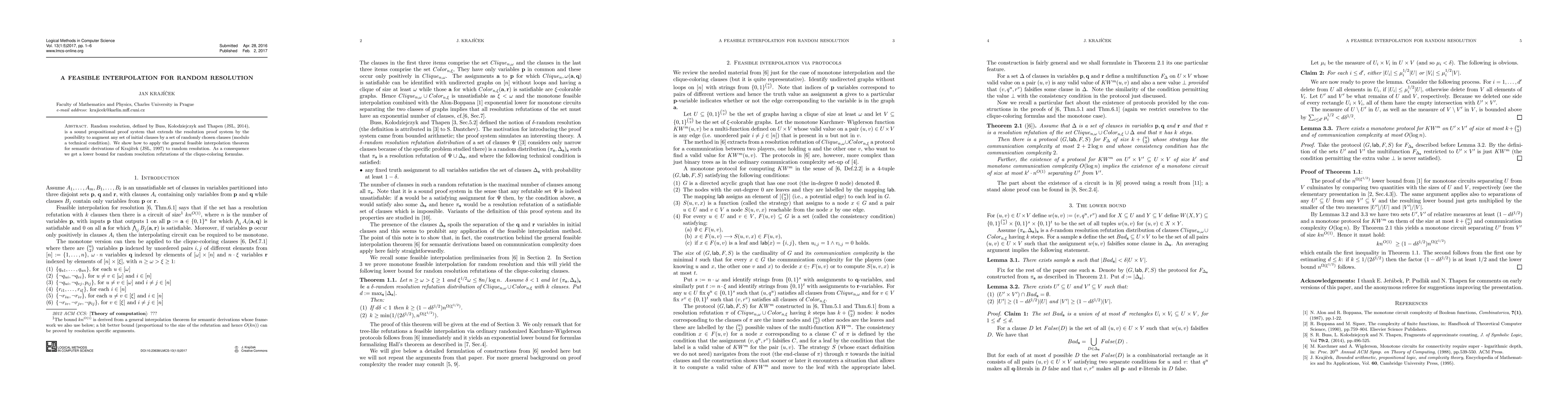 This paper demonstrates an application of Krajicek's feasible interpolation theorem to the random resolution proof system, establishing a lower bound for refutations of clique-coloring formulas within this proof framework.