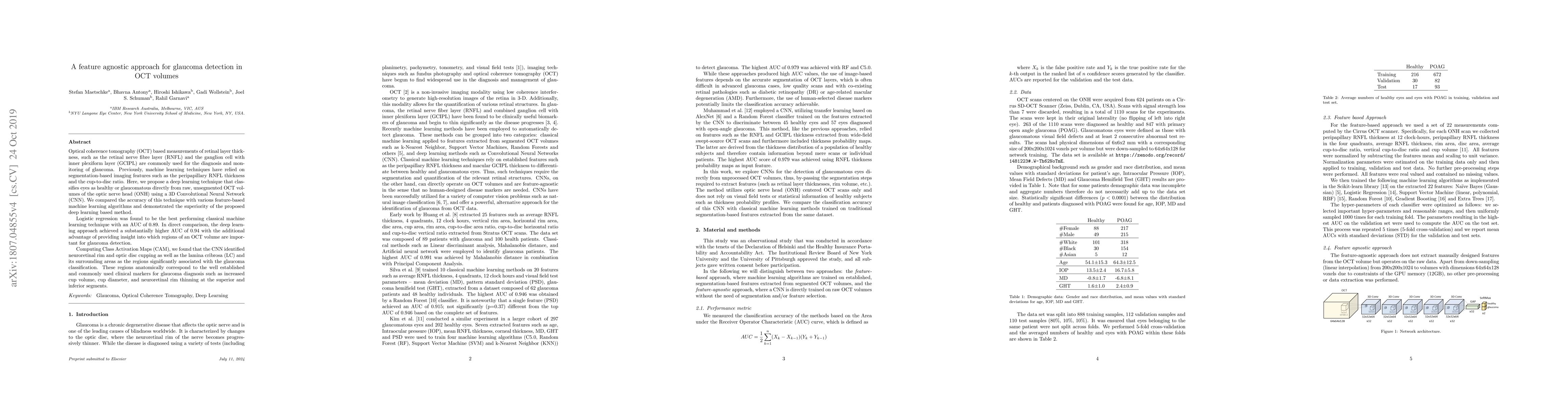 This paper proposes a deep learning method using a 3D CNN to classify OCT volumes directly from raw, unsegmented data for glaucoma detection, achieving a higher AUC of 0.94 compared to classical machine learning techniques. The method identifies key anatomical regions like the neuroretinal rim and optic disc cupping that are crucial for glaucoma diagnosis.
