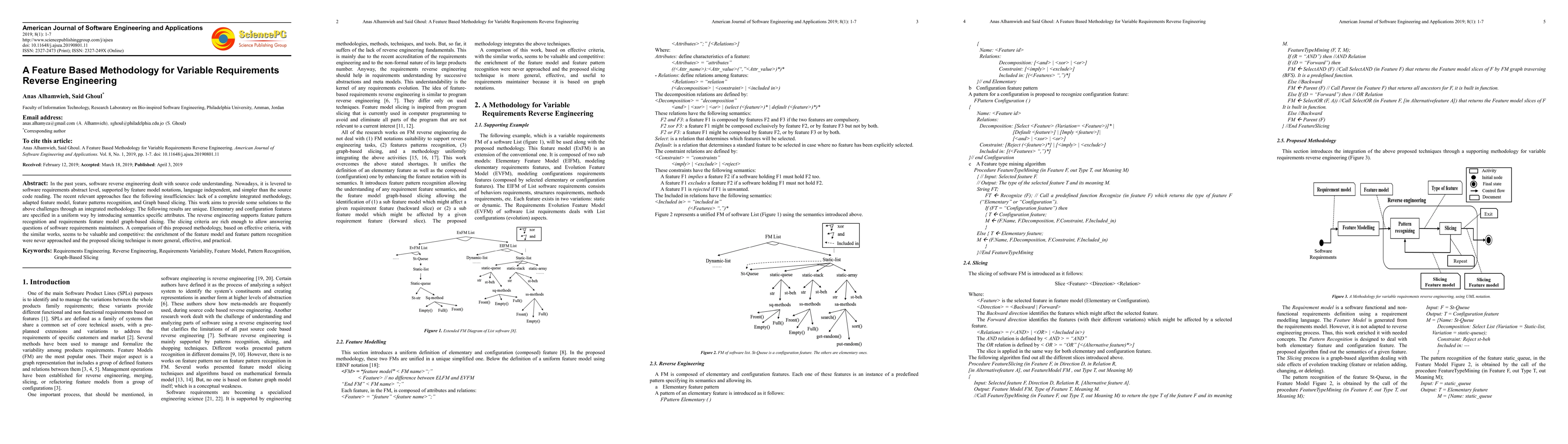 This paper proposes an integrated methodology for variable requirements reverse engineering at the abstract level, addressing the lack of complete methodologies, adapted feature models, feature pattern recognition, and graph-based slicing. It introduces semantics-specific attributes for elementary and configuration features, supports feature pattern recognition, and provides a general, effective, and practical graph-based slicing technique.