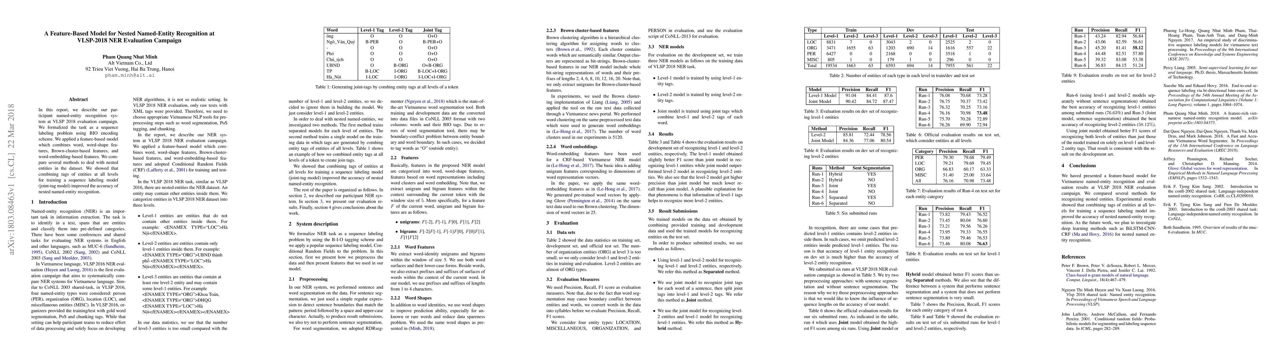 In this report, we describe our participant named-entity recognition system at VLSP 2018 evaluation campaign. We formalized the task as a sequence labeling problem using BIO encoding scheme. We applied a feature-based model which combines word, word-shape features, Brown-cluster-based features, and word-embedding-based features. We compare several methods to deal with nested entities in the dataset. We showed that combining tags of entities at all levels for training a sequence labeling model (joint-tag model) improved the accuracy of nested named-entity recognition.
