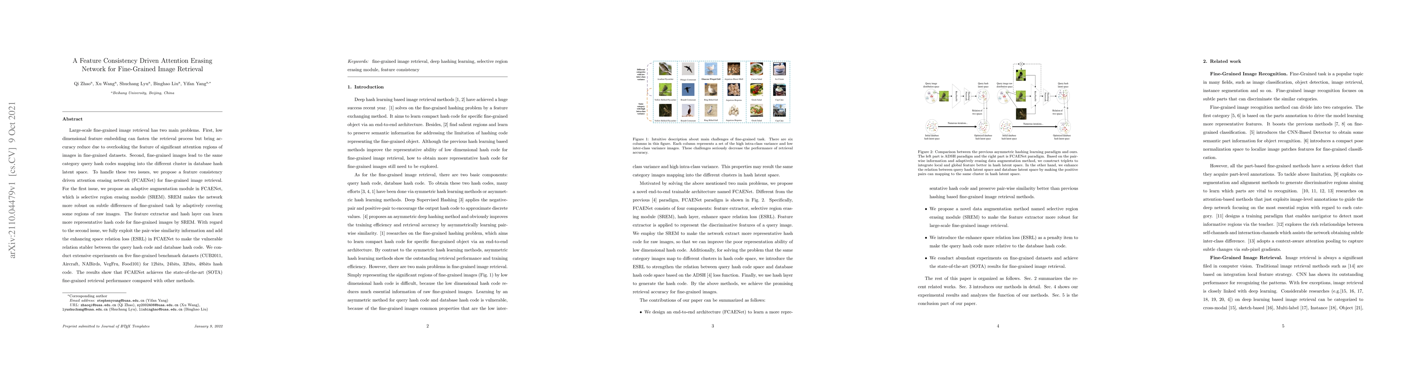 The paper proposes a Feature Consistency Driven Attention Erasing Network (FCAENet) to tackle accuracy reduction in fine-grained image retrieval due to low-dimensional feature embedding and inconsistent hash code mapping. The network uses a selective region erasing module (SREM) to enhance feature representation and an enhancing space relation loss (ESRL) to stabilize query-database hash code relations, achieving state-of-the-art performance on multiple fine-grained datasets.