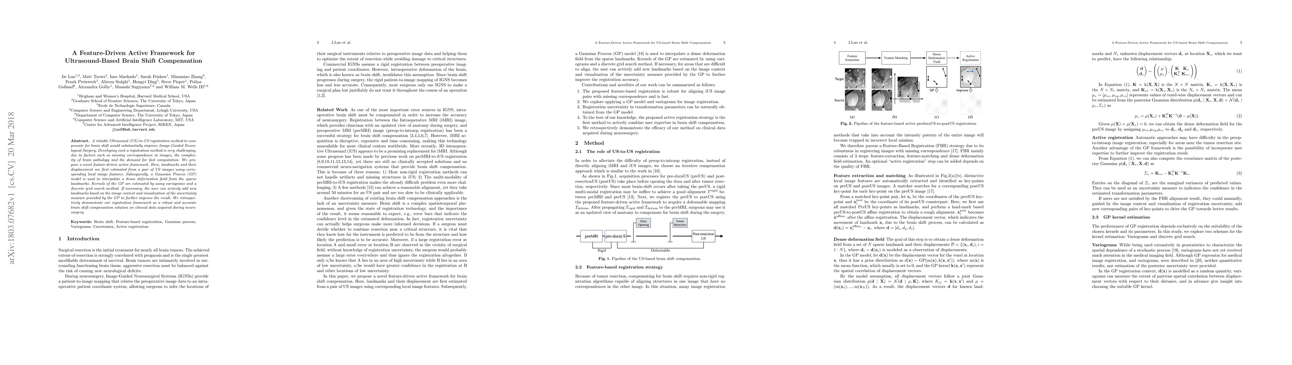 A reliable Ultrasound (US)-to-US registration method to compensate for brain shift would substantially improve Image-Guided Neurological Surgery. Developing such a registration method is very challenging, due to factors such as missing correspondence in images, the complexity of brain pathology and the demand for fast computation. We propose a novel feature-driven active framework. Here, landmarks and their displacement are first estimated from a pair of US images using corresponding local image features. Subsequently, a Gaussian Process (GP) model is used to interpolate a dense deformation field from the sparse landmarks. Kernels of the GP are estimated by using variograms and a discrete grid search method. If necessary, the user can actively add new landmarks based on the image context and visualization of the uncertainty measure provided by the GP to further improve the result. We retrospectively demonstrate our registration framework as a robust and accurate brain shift compensation solution on clinical data acquired during neurosurgery.