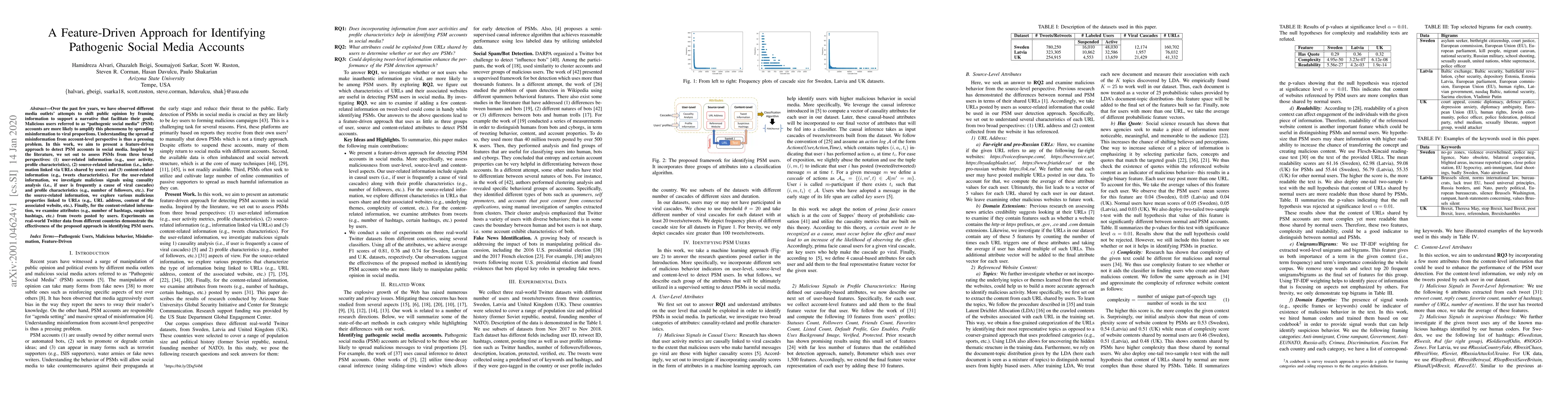 This paper proposes a feature-driven method to detect "pathogenic social media" (PSM) accounts that spread misinformation. It analyzes user-related, source-related, and content-related features to identify malicious signals and profile characteristics, demonstrating effectiveness through experiments on Twitter data.