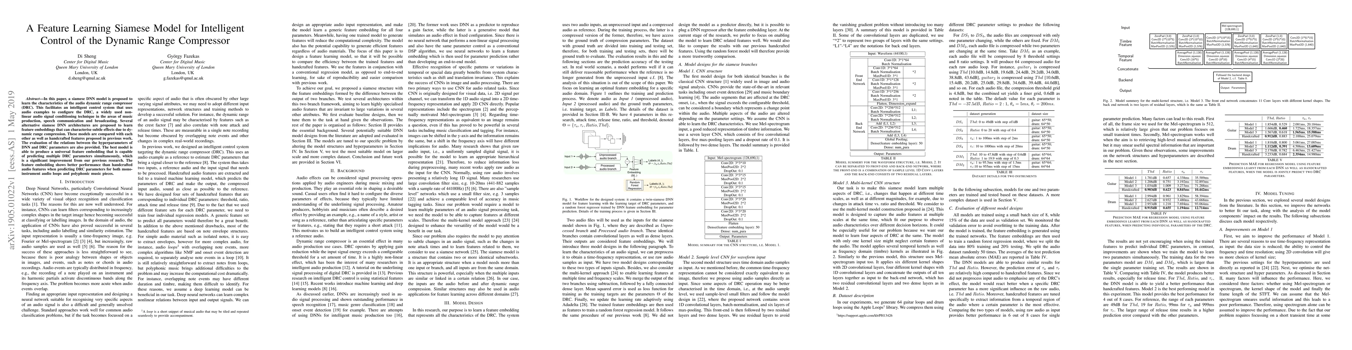 A siamese neural network model learns to characterize audio dynamic range compression, enabling intelligent control of DRC in music production, speech communication, and broadcasting. The best model produces universal feature embeddings that outperform handcrafted features in predicting multiple DRC parameters.