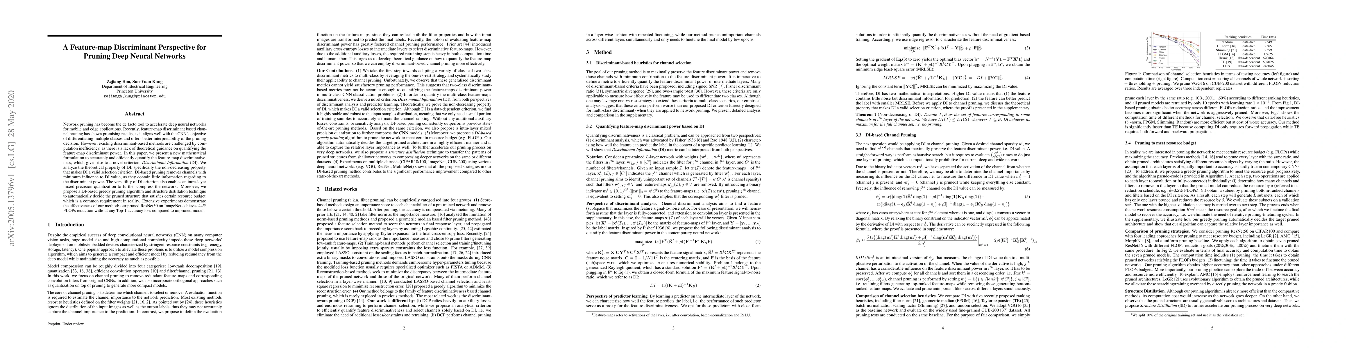 Researchers propose a new pruning method for deep neural networks that uses a 'Discriminant Information' metric to efficiently remove channels while preserving accuracy, achieving up to 44% FLOPs reduction on ImageNet.