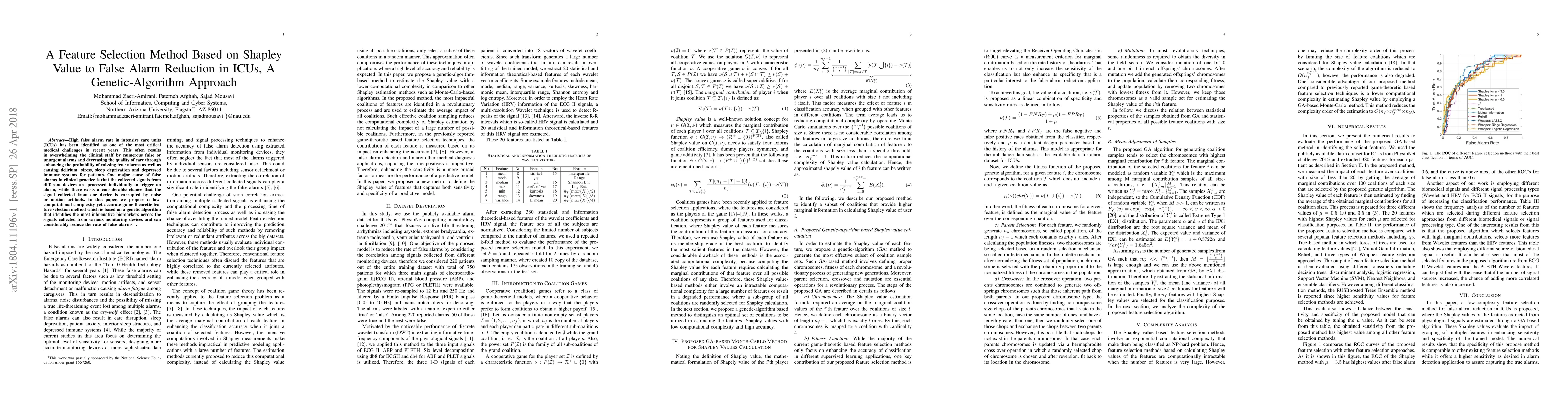 High false alarm rate in intensive care units (ICUs) has been identified as one of the most critical medical challenges in recent years. This often results in overwhelming the clinical staff by numerous false or unurgent alarms and decreasing the quality of care through enhancing the probability of missing true alarms as well as causing delirium, stress, sleep deprivation and depressed immune systems for patients. One major cause of false alarms in clinical practice is that the collected signals from different devices are processed individually to trigger an alarm, while there exists a considerable chance that the signal collected from one device is corrupted by noise or motion artifacts. In this paper, we propose a low-computational complexity yet accurate game-theoretic feature selection method which is based on a genetic algorithm that identifies the most informative biomarkers across the signals collected from various monitoring devices and can considerably reduce the rate of false alarms.