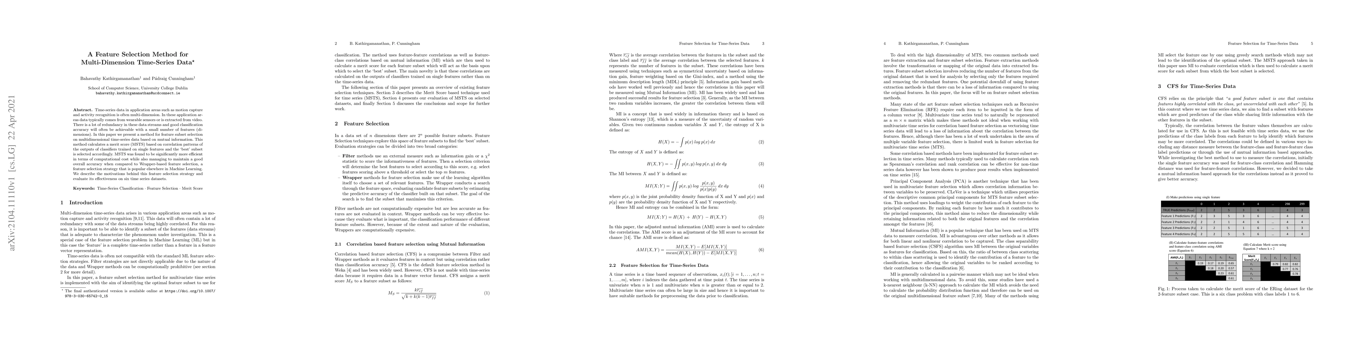 This paper introduces a feature selection method for multidimensional time-series data using mutual information, which calculates a merit score (MSTS) based on classifier output correlations. The proposed method is more computationally efficient while maintaining high accuracy compared to Wrapper-based selection, as demonstrated through evaluations on six datasets.