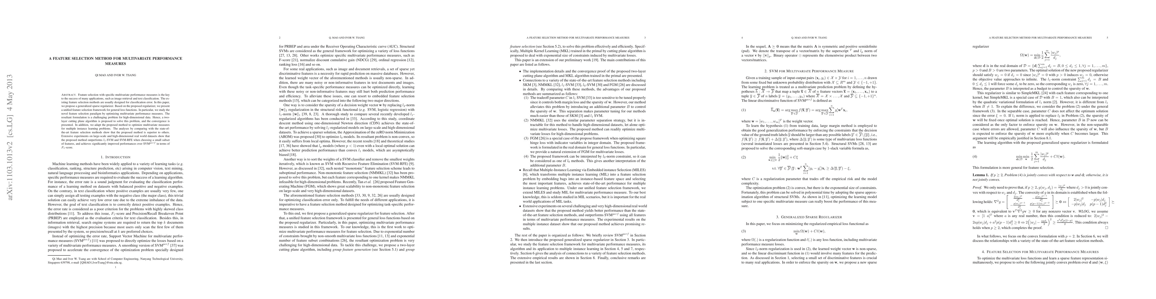The paper proposes a generalized sparse regularizer and a unified feature selection framework for general loss functions, focusing on optimizing multivariate performance measures with a two-layer cutting plane algorithm.