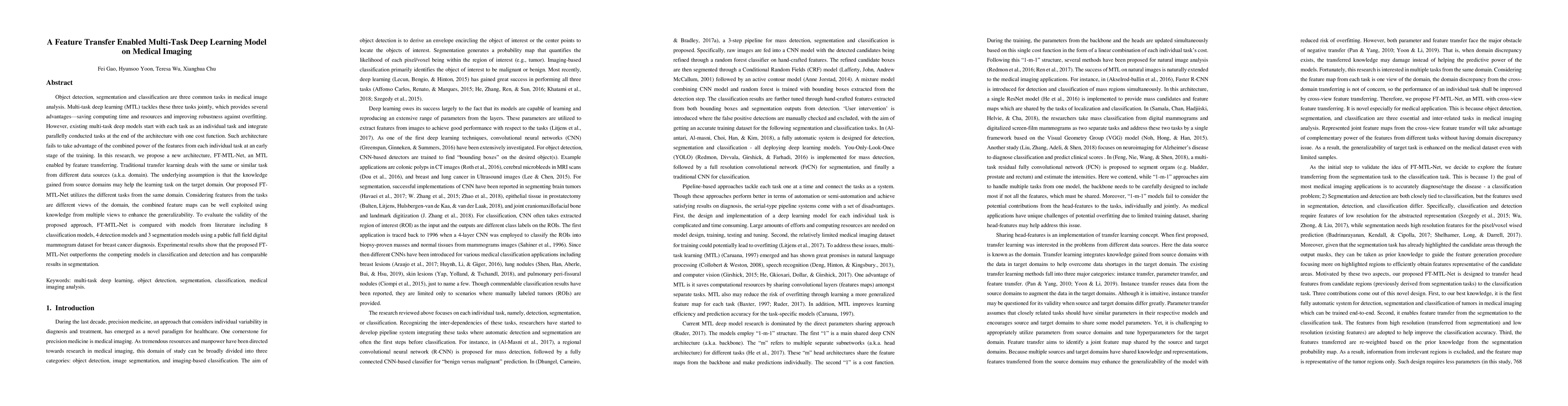 Object detection, segmentation and classification are three common tasks in medical image analysis. Multi-task deep learning (MTL) tackles these three tasks jointly, which provides several advantages saving computing time and resources and improving robustness against overfitting. However, existing multitask deep models start with each task as an individual task and integrate parallelly conducted tasks at the end of the architecture with one cost function. Such architecture fails to take advantage of the combined power of the features from each individual task at an early stage of the training. In this research, we propose a new architecture, FTMTLNet, an MTL enabled by feature transferring. Traditional transfer learning deals with the same or similar task from different data sources (a.k.a. domain). The underlying assumption is that the knowledge gained from source domains may help the learning task on the target domain. Our proposed FTMTLNet utilizes the different tasks from the same domain. Considering features from the tasks are different views of the domain, the combined feature maps can be well exploited using knowledge from multiple views to enhance the generalizability. To evaluate the validity of the proposed approach, FTMTLNet is compared with models from literature including 8 classification models, 4 detection models and 3 segmentation models using a public full field digital mammogram dataset for breast cancer diagnosis. Experimental results show that the proposed FTMTLNet outperforms the competing models in classification and detection and has comparable results in segmentation.