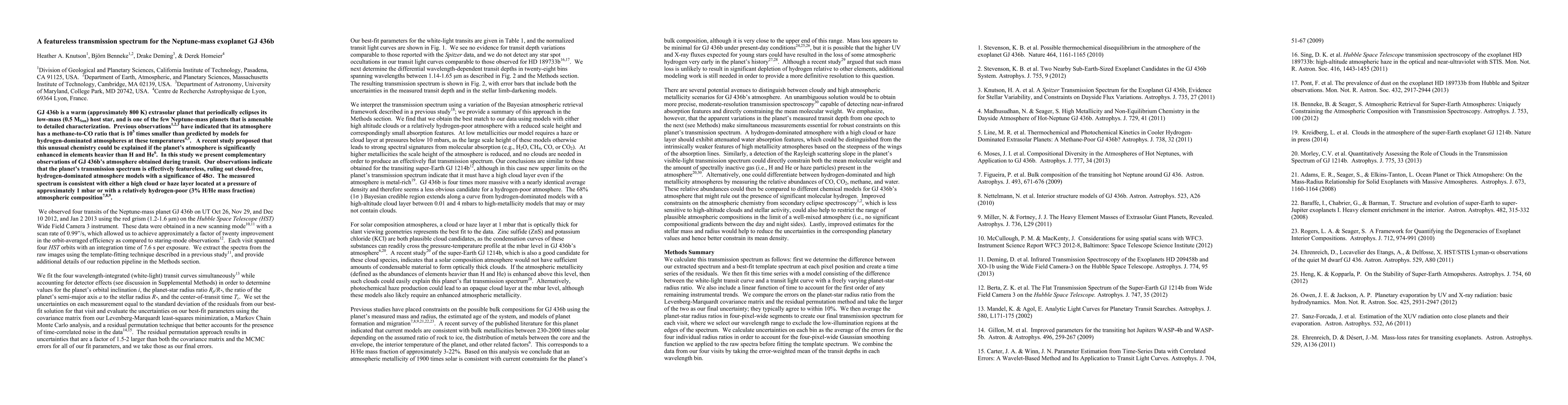 This study reveals a featureless transmission spectrum for the Neptune-mass exoplanet GJ 436b, ruling out cloud-free, hydrogen-dominated atmosphere models and suggesting a high cloud or haze layer or a hydrogen-poor atmospheric composition.