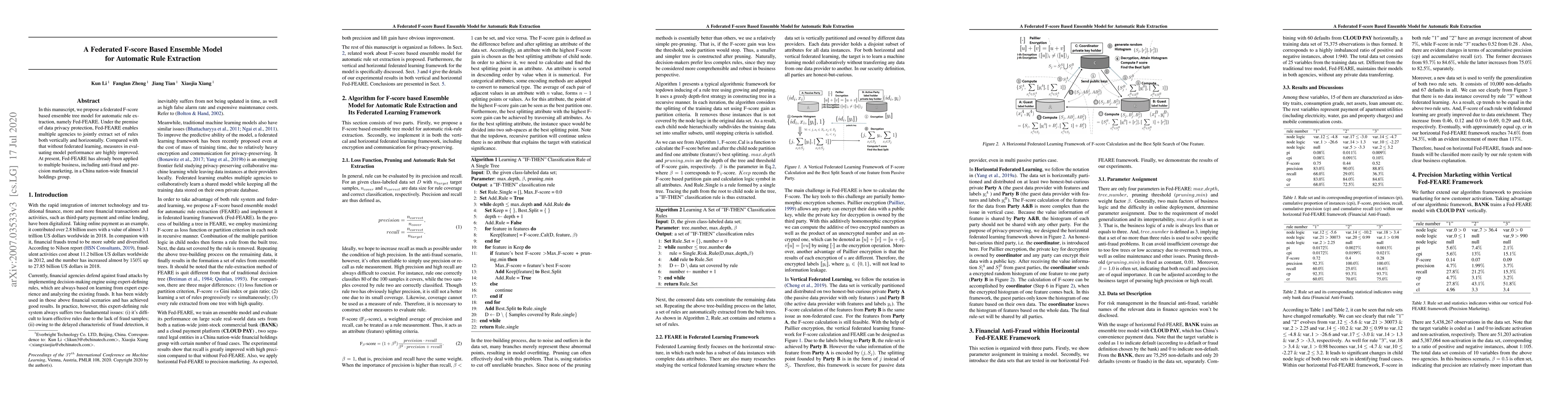 This paper introduces Fed-FEARE, a federated F-score based ensemble model for automatic rule extraction, which allows multiple agencies to collaboratively extract rules while protecting data privacy. The model significantly improves performance metrics compared to non-federated approaches and has been applied in anti-fraud and precision marketing within a nationwide financial group in China.