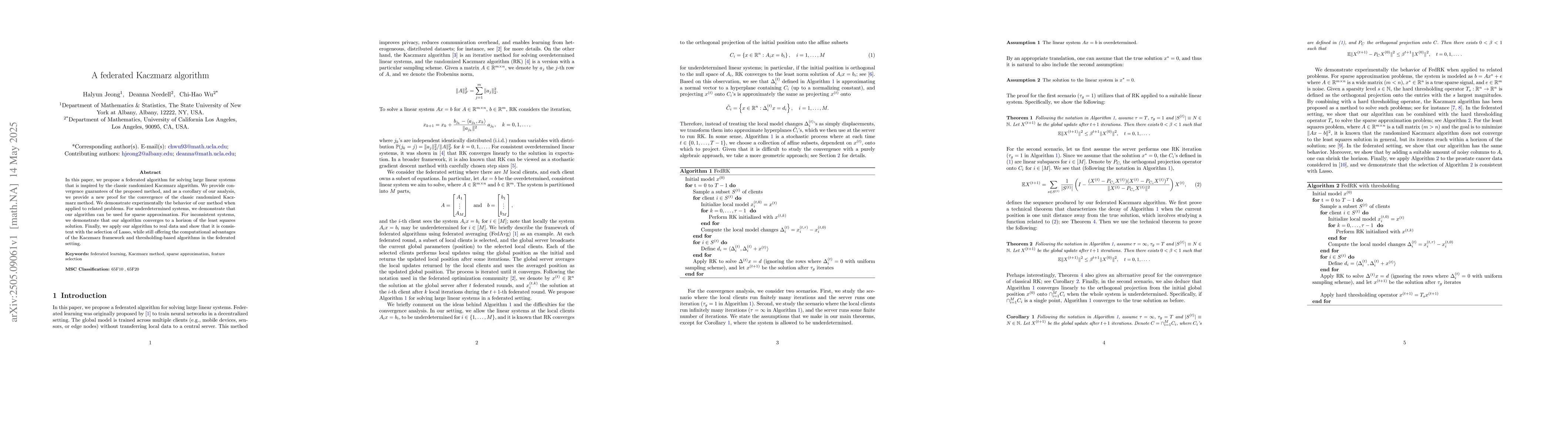 The research proposes a federated algorithm inspired by the classic randomized Kaczmarz method for solving large linear systems, providing convergence guarantees and a new proof for the classic method's convergence.