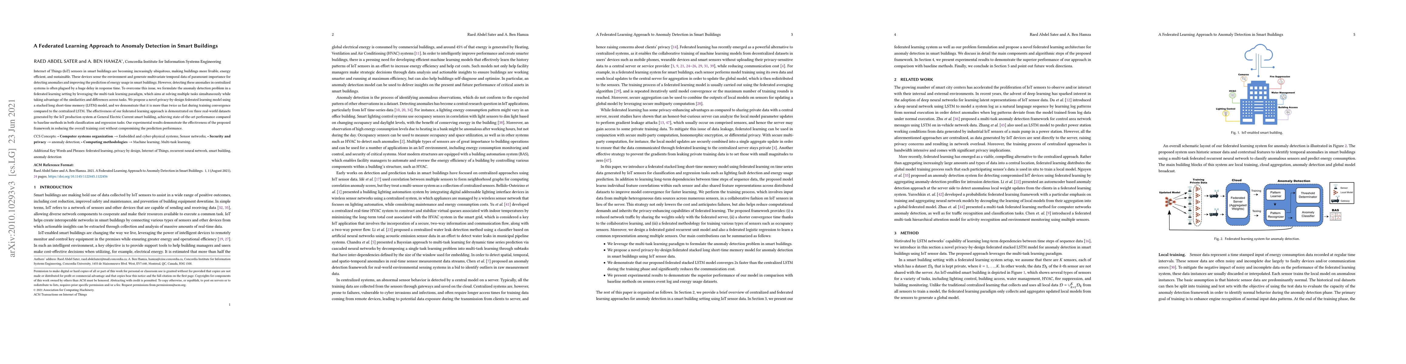 This paper proposes a federated learning approach to detect anomalies in smart buildings using IoT sensor data. The method leverages a stacked LSTM model to achieve faster training convergence and state-of-the-art performance compared to centralized systems, while maintaining privacy and reducing overall training costs.