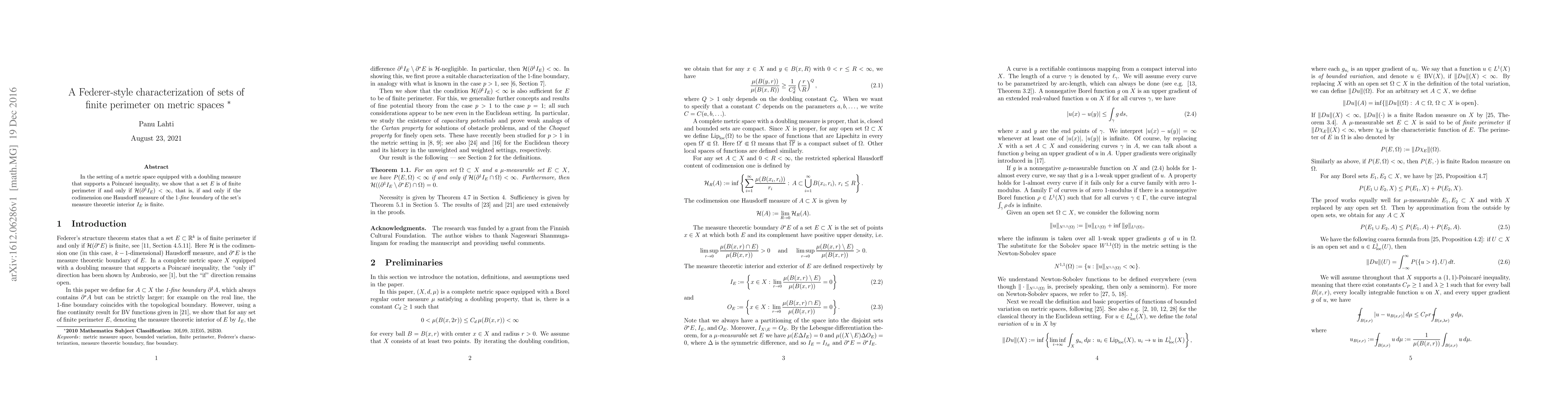 Summary: This paper establishes a Federer-style characterization of sets of finite perimeter in metric spaces, proving that such sets are characterized by having a finite codimension one Hausdorff measure on their 1-fine boundary.