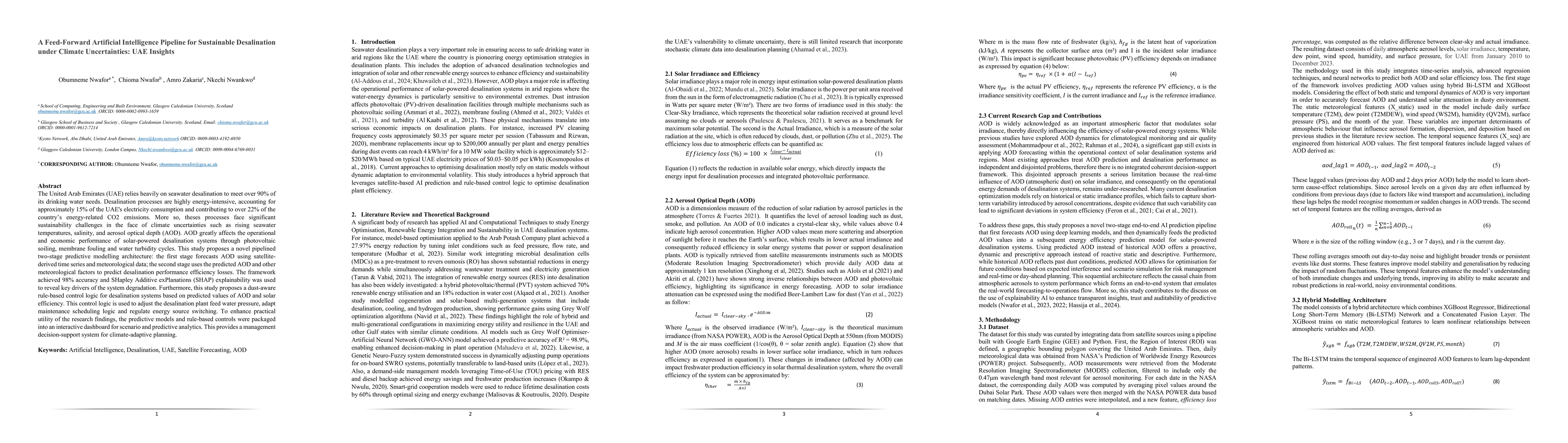The United Arab Emirates (UAE) relies heavily on seawater desalination to meet over 90% of its drinking water needs. Desalination processes are highly energy intensive and account for approximately 15% of the UAE's electricity consumption, contributing to over 22% of the country's energy-related CO2 emissions. Moreover, these processes face significant sustainability challenges in the face of climate uncertainties such as rising seawater temperatures, salinity, and aerosol optical depth (AOD). AOD greatly affects the operational and economic performance of solar-powered desalination systems through photovoltaic soiling, membrane fouling, and water turbidity cycles. This study proposes a novel pipelined two-stage predictive modelling architecture: the first stage forecasts AOD using satellite-derived time series and meteorological data; the second stage uses the predicted AOD and other meteorological factors to predict desalination performance efficiency losses. The framework achieved 98% accuracy, and SHAP (SHapley Additive exPlanations) was used to reveal key drivers of system degradation. Furthermore, this study proposes a dust-aware rule-based control logic for desalination systems based on predicted values of AOD and solar efficiency. This control logic is used to adjust the desalination plant feed water pressure, adapt maintenance scheduling, and regulate energy source switching. To enhance the practical utility of the research findings, the predictive models and rule-based controls were packaged into an interactive dashboard for scenario and predictive analytics. This provides a management decision-support system for climate-adaptive planning.
