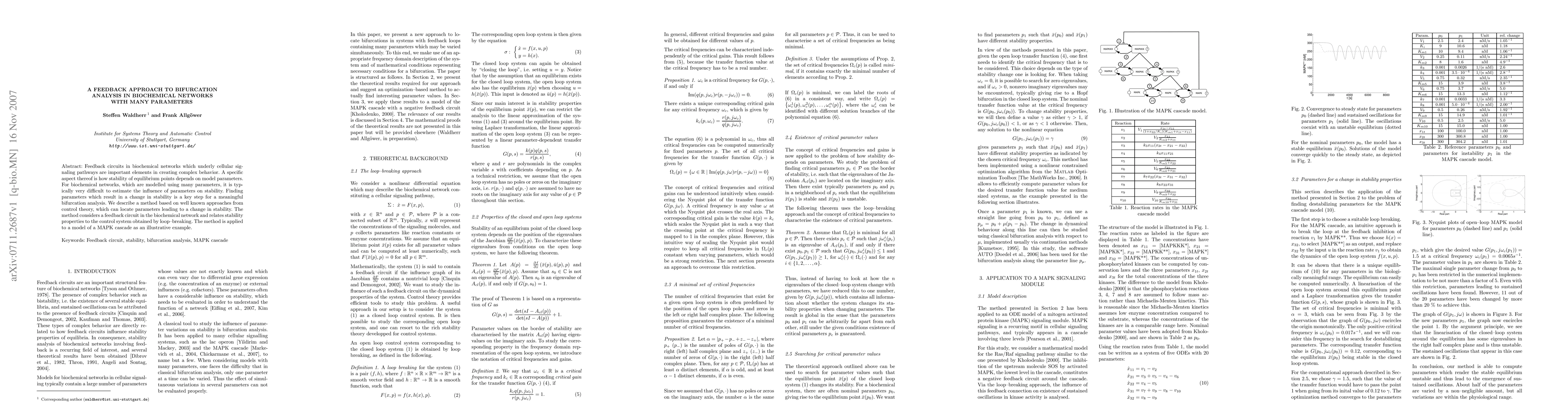 Feedback circuits in biochemical networks which underly cellular signaling pathways are important elements in creating complex behavior. A specific aspect thereof is how stability of equilibrium points depends on model parameters. For biochemical networks, which are modelled using many parameters, it is typically very difficult to estimate the influence of parameters on stability. Finding parameters which result in a change in stability is a key step for a meaningful bifurcation analysis. We describe a method based on well known approaches from control theory, which can locate parameters leading to a change in stability. The method considers a feedback circuit in the biochemical network and relates stability properties to the control system obtained by loop--breaking. The method is applied to a model of a MAPK cascade as an illustrative example.