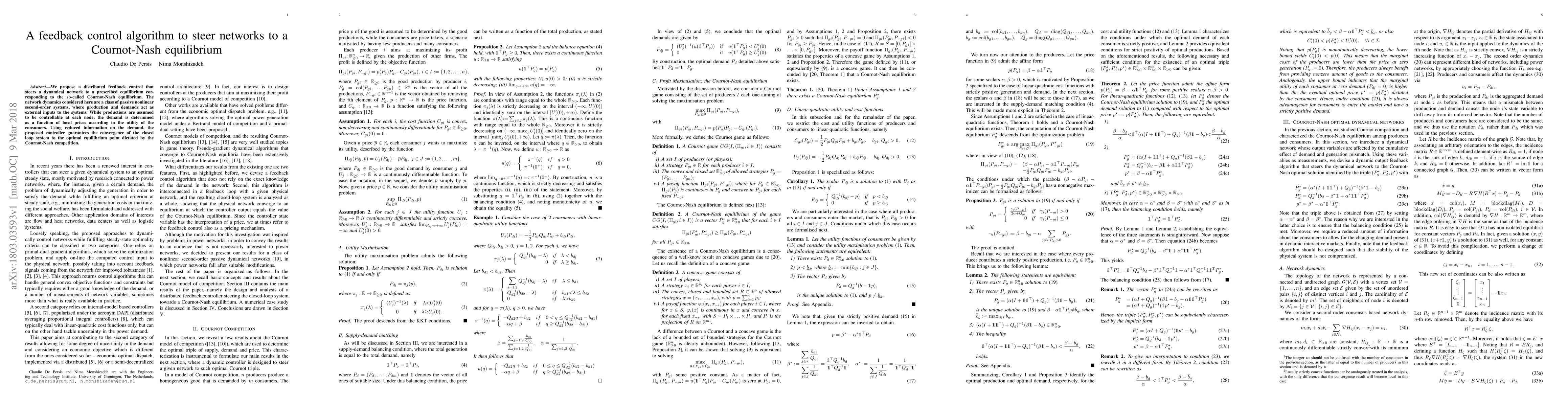 We propose a distributed feedback control that steers a dynamical network to a prescribed equilibrium corresponding to the so-called Cournot-Nash equilibrium. The network dynamics considered here are a class of passive nonlinear second-order systems, where production and demands act as external inputs to the systems. While productions are assumed to be controllable at each node, the demand is determined as a function of local prices according to the utility of the consumers. Using reduced information on the demand, the proposed controller guarantees the convergence of the closed loop system to the optimal equilibrium point dictated by the Cournot-Nash competition.