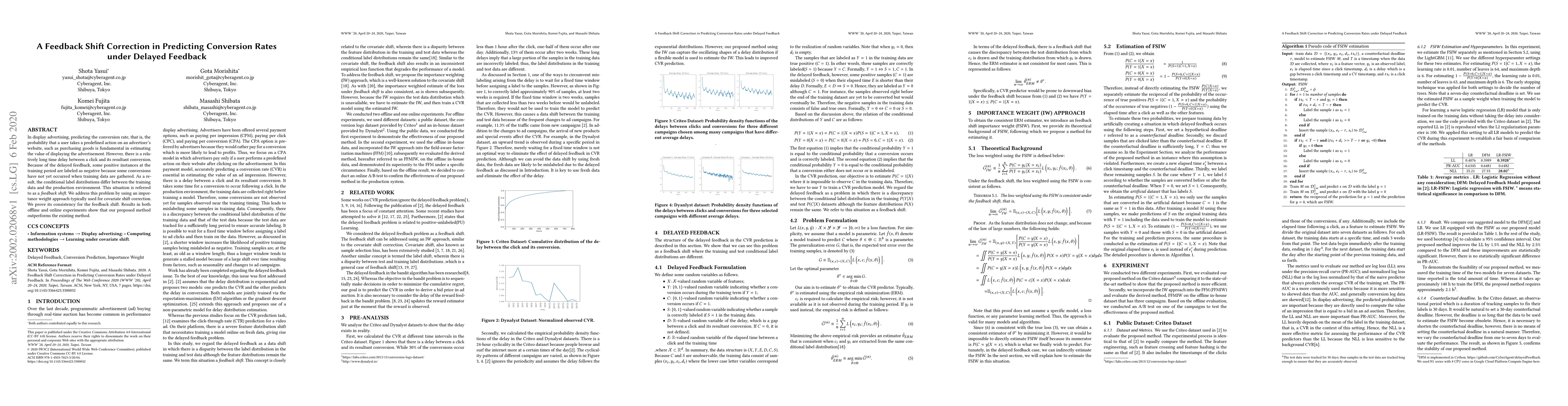 In display advertising, predicting the conversion rate, that is, the probability that a user takes a predefined action on an advertiser's website, such as purchasing goods is fundamental in estimating the value of displaying the advertisement. However, there is a relatively long time delay between a click and its resultant conversion. Because of the delayed feedback, some positive instances at the training period are labeled as negative because some conversions have not yet occurred when training data are gathered. As a result, the conditional label distributions differ between the training data and the production environment. This situation is referred to as a feedback shift. We address this problem by using an importance weight approach typically used for covariate shift correction. We prove its consistency for the feedback shift. Results in both offline and online experiments show that our proposed method outperforms the existing method.
