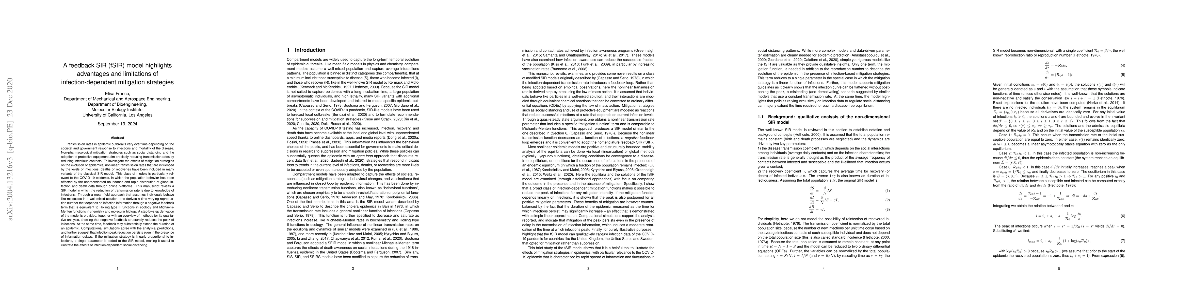 Transmission rates in epidemic outbreaks may vary over time depending on the societal response. Non-pharmacological mitigation strategies such as social distancing and the adoption of protective equipment aim precisely at reducing transmission rates by reducing infectious contacts. To investigate the effects of mitigation strategies on the evolution of epidemics, nonlinear transmission rates that are influenced by the levels of infections, deaths or recoveries have been included in many variants of the classical SIR model. This class of models is particularly relevant to the COVID-19 epidemic, in which the population behavior has been affected by the unprecedented abundance and rapid distribution of global infection and death data through online platforms. This manuscript revisits a SIR model in which the reduction of transmission rate is due to knowledge of infections. Through a mean field approach that assumes individuals behave like molecules in a well-mixed solution, one derives a time-varying reproduction number that depends on infection information through a negative feedback term that is equivalent to Holling type II functions in ecology and Michaelis-Menten functions in chemistry and molecular biology. A step-by-step derivation of the model is provided, together with an overview of methods for its qualitative analysis, showing that negative feedback structurally reduces the peak of infections. At the same time, feedback may substantially extend the duration of an epidemic. Computational simulations agree with the analytical predictions, and further suggest that infection peak reduction persists even in the presence of information delays. If the mitigation strategy is linearly proportional to infections, a single parameter is added to the SIR model, making it useful to illustrate the effects of infection-dependent social distancing.