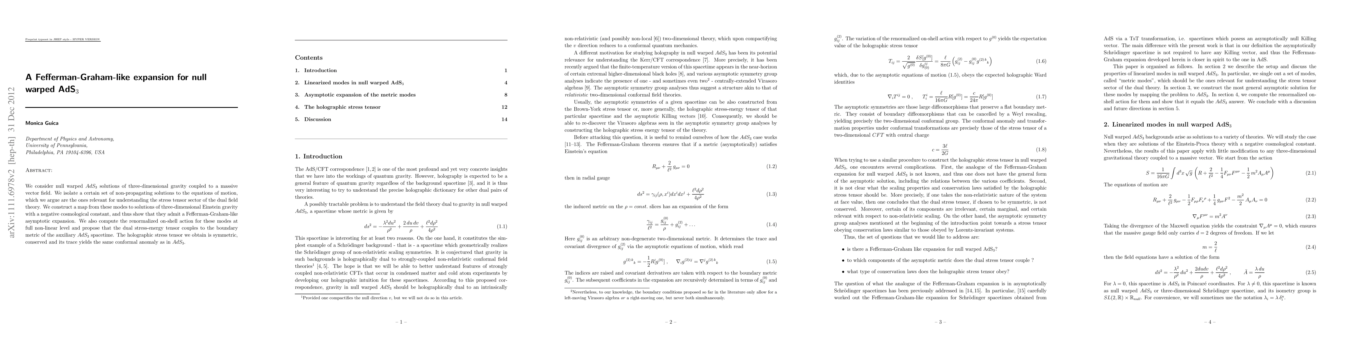 This paper explores null warped AdS(3) solutions in three-dimensional gravity with a massive vector field, identifying relevant non-propagating modes. It constructs a Fefferman-Graham-like expansion for these modes, computes their renormalized on-shell action, and proposes a symmetric, conserved holographic stress tensor with a conformal anomaly matching that of AdS(3).