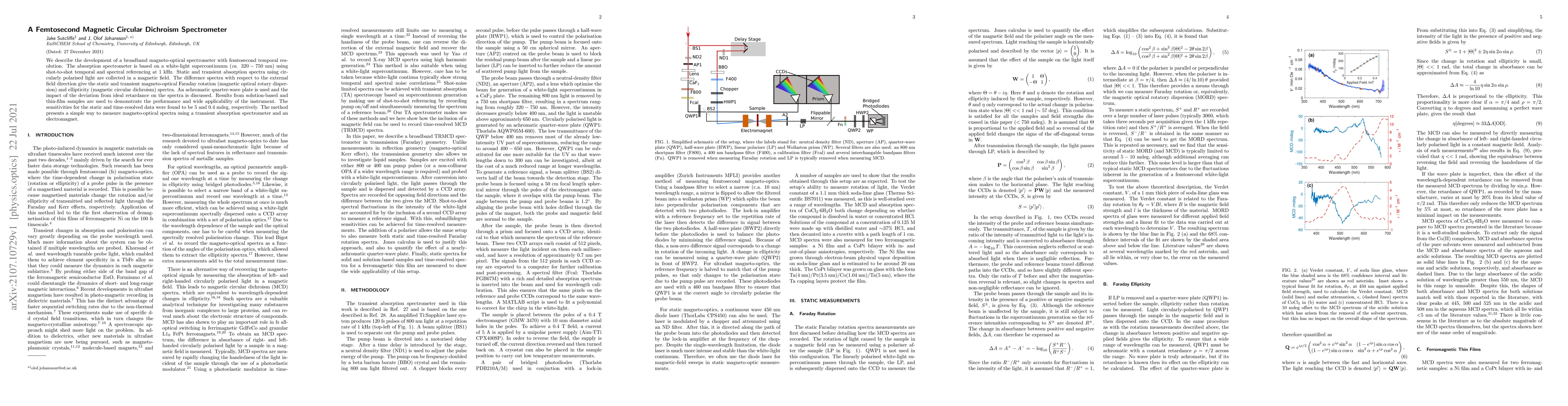 A new spectrometer with femtosecond temporal resolution measures magneto-optical spectra using transient absorption and circularly polarized light, achieving sensitivities of 5 mdeg for static data and 0.4 mdeg for time-resolved data.