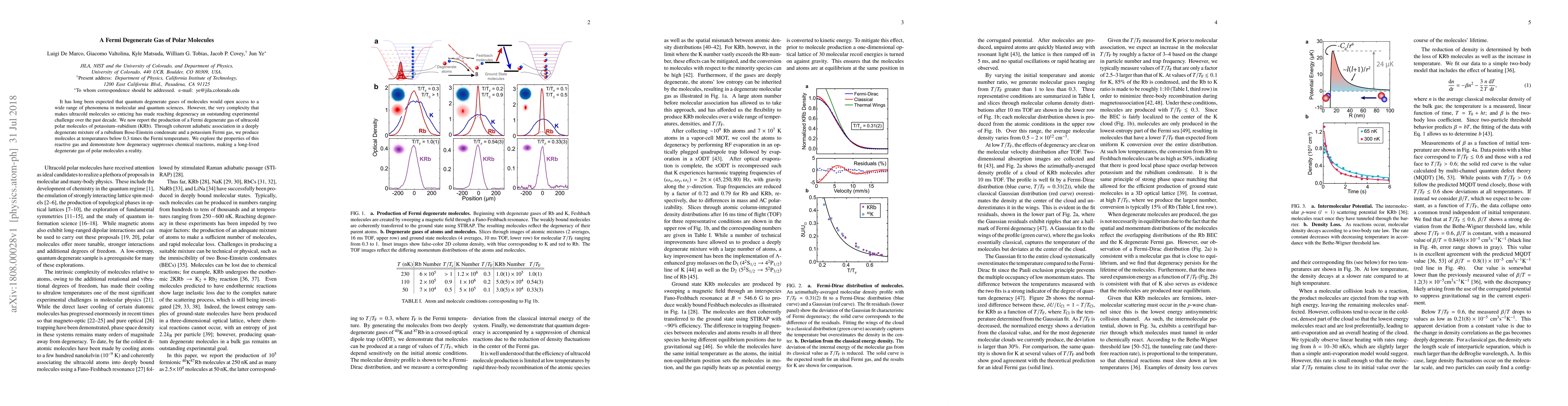 This paper reports the first production of a Fermi degenerate gas of ultracold polar molecules (KRb) through coherent adiabatic association, demonstrating the suppression of chemical reactions due to degeneracy and paving the way for novel phenomena in molecular and quantum sciences.