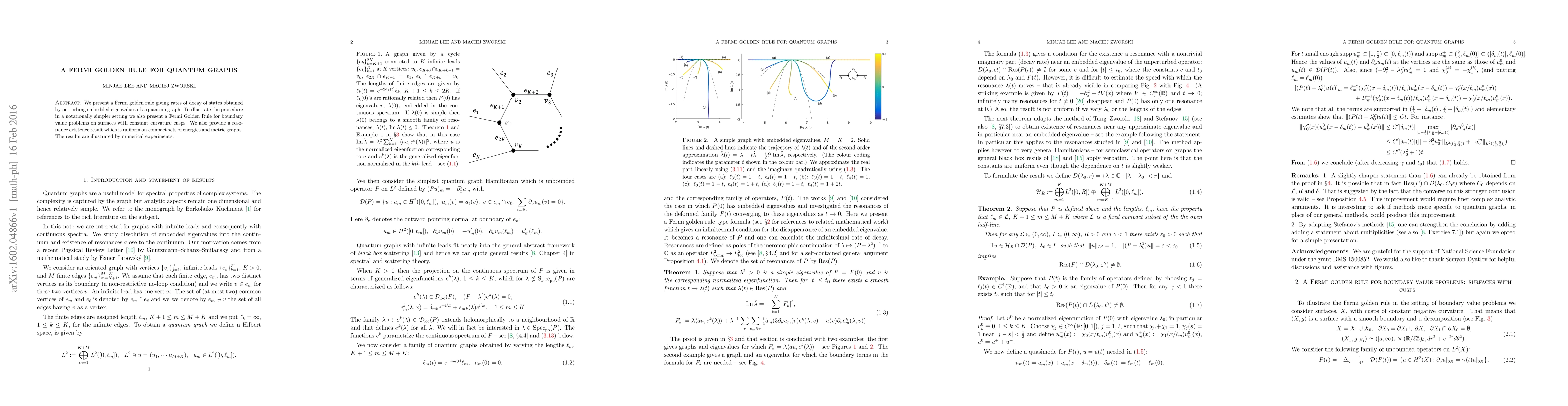 This paper presents a Fermi golden rule for decay rates of states in quantum graphs, extending the concept to boundary value problems on surfaces with cusps. It also provides a uniform resonance existence result and illustrates findings with numerical experiments.