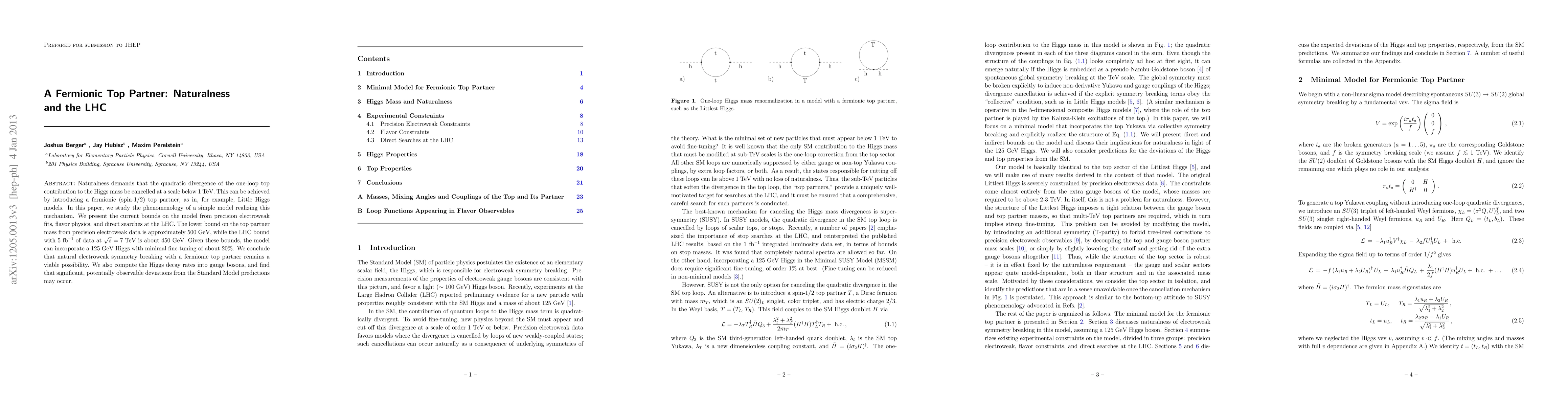 This paper explores a fermionic top partner model to address naturalness in electroweak symmetry breaking, finding that a top partner mass above 450 GeV is required by LHC data and precision electroweak fits. The model allows for a 125 GeV Higgs with minimal fine-tuning and predicts potentially observable deviations in Higgs decay rates.