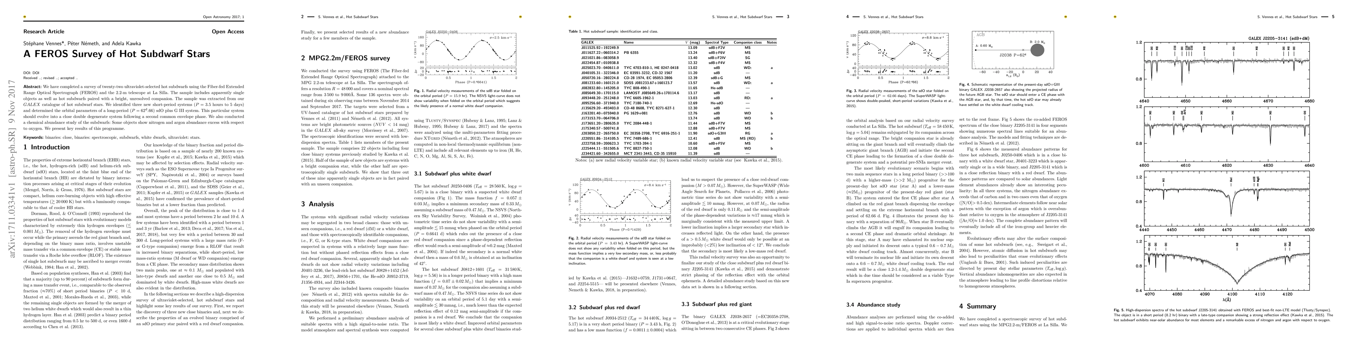 We have completed a survey of twenty-two ultraviolet-selected hot subdwarfs using the Fiber-fed Extended Range Optical Spectrograph (FEROS) and the 2.2-m telescope at La Silla. The sample includes apparently single objects as well as hot subdwarfs paired with a bright, unresolved companion. The sample was extracted from our GALEX catalogue of hot subdwarf stars. We identified three new short-period systems (P=3.5 hours to 5 days) and determined the orbital parameters of a long-period (P=62.66 d) sdO plus G III system. This particular system should evolve into a close double degenerate system following a second common envelope phase. We also conducted a chemical abundance study of the subdwarfs: Some objects show nitrogen and argon abundance excess with respect to oxygen. We present key results of this programme.
