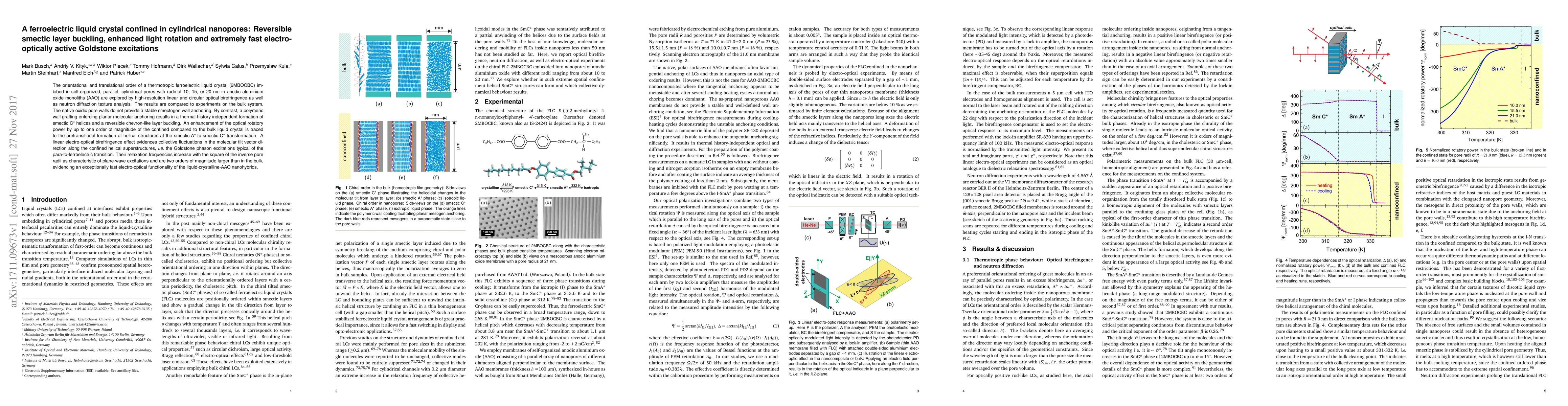 The paper investigates a ferroelectric liquid crystal in nanopores, finding that confinement leads to reversible layer buckling, enhanced optical rotation, and extremely fast electro-optical activity due to Goldstone excitations. This is achieved by grafting polymeric walls for stable anchoring, unlike native oxidic walls. The findings suggest potential for fast, nanostructured electro-optic devices.