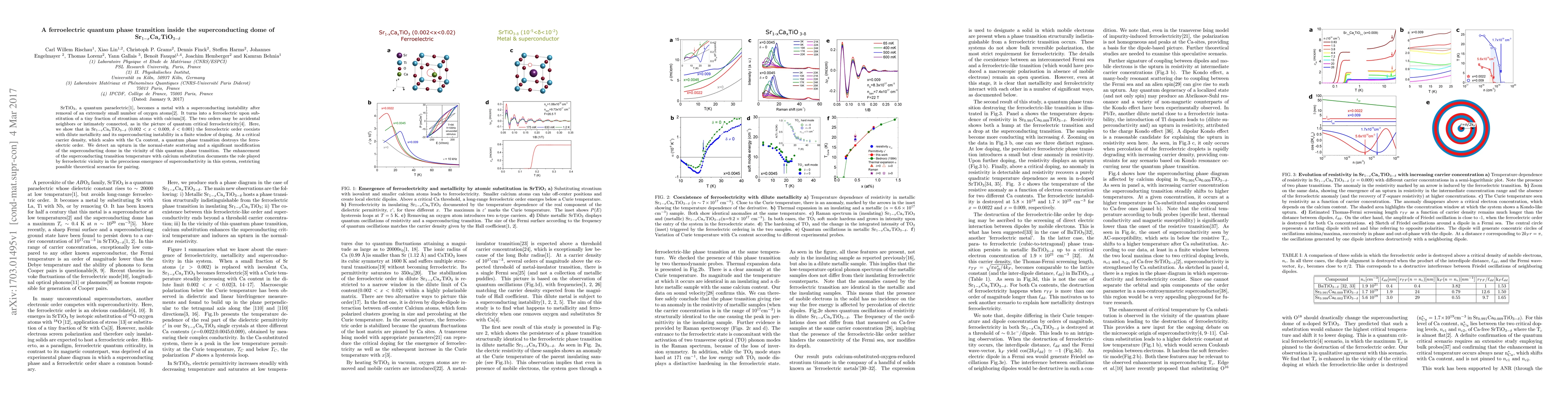 This paper investigates the coexistence of ferroelectricity and superconductivity in Sr$_{1-x}$Ca$_{x}$TiO$_{3-\delta}$ and reveals a quantum phase transition that destroys ferroelectric order at a critical carrier density, impacting the superconducting properties. The findings suggest a significant role of ferroelectricity in the emergence of superconductivity.