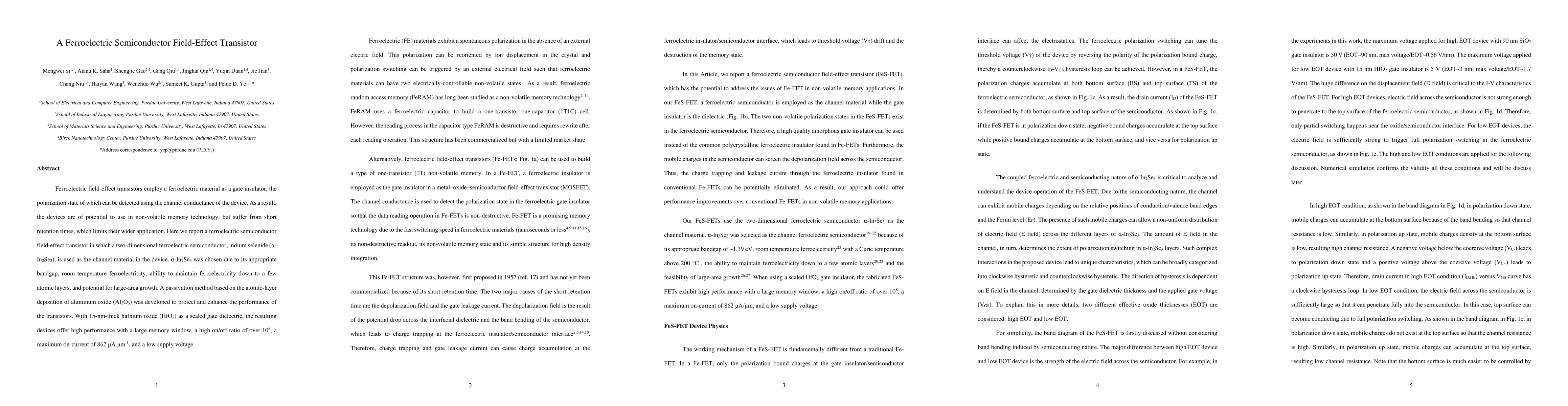 This paper reports on a ferroelectric semiconductor field-effect transistor using a two-dimensional material, indium selenide, as the channel. It showcases enhanced performance with a high on/off ratio and low supply voltage, aiming to improve retention times for non-volatile memory applications.