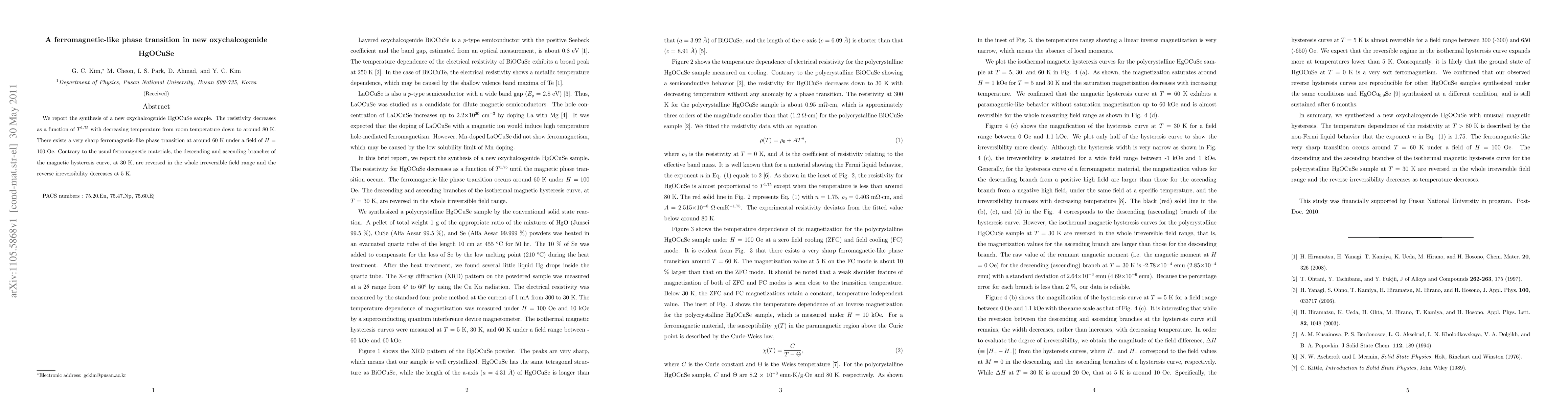 We report the synthesis of a new oxychalcogenide HgOCuSe sample. The resistivity decreases as a function of $T^{1.75}$ with decreasing temperature from room temperature down to around 80 K. There exists a very sharp ferromagnetic-like phase transition at around 60 K under a field of $H$ = 100 Oe. Contrary to the usual ferromagnetic materials, the descending and ascending branches of the magnetic hysteresis curve, at 30 K, are reversed in the whole irreversible field range and the reverse irreversibility decreases at 5 K.