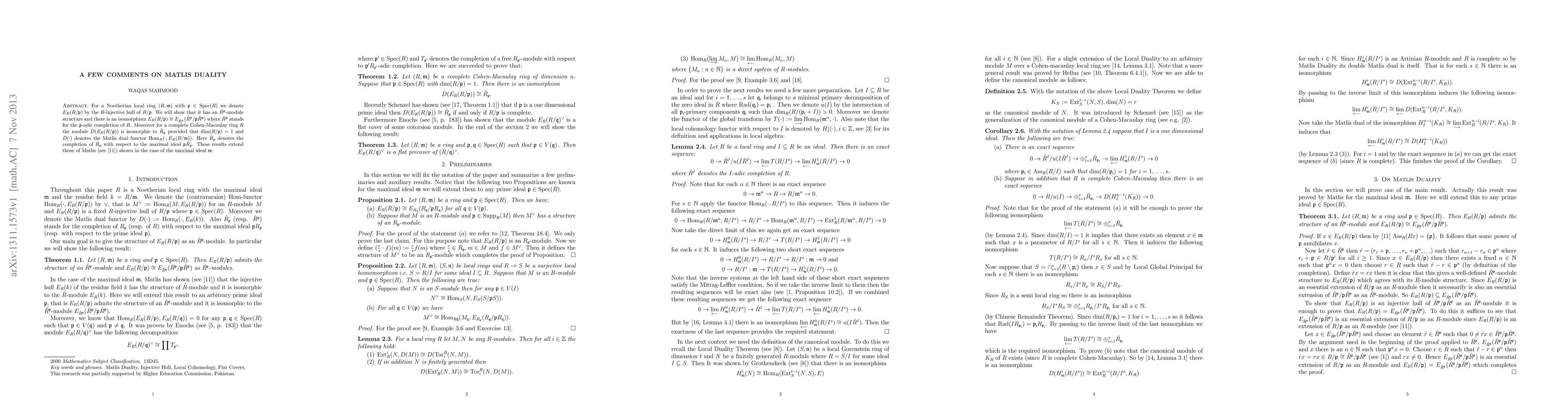 The paper discusses the injective hull $E_R(R/\mathfrak{p})$ for a Noetherian local ring $(R,{\mathfrak m})$ and shows that it has an $\hat{R}^\mathfrak{p}$-module structure, where $\hat{R}^\mathfrak{p}$ is the $\mathfrak{p}$-adic completion of $R$. It also establishes an isomorphism involving this structure and extends Matlis duality results to complete Cohen-Macaulay rings under specific conditions.