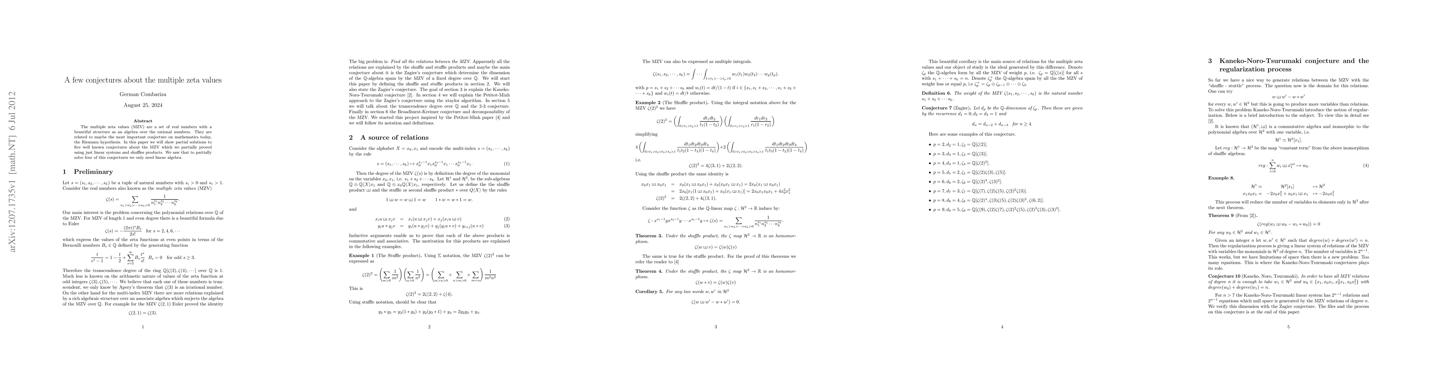 This paper presents partial solutions to five conjectures regarding multiple zeta values (MZV), employing linear systems and shuffle products. It demonstrates that linear algebra suffices to partially solve four of these conjectures, highlighting the algebraic structure of MZVs and their connection to the Riemann hypothesis.