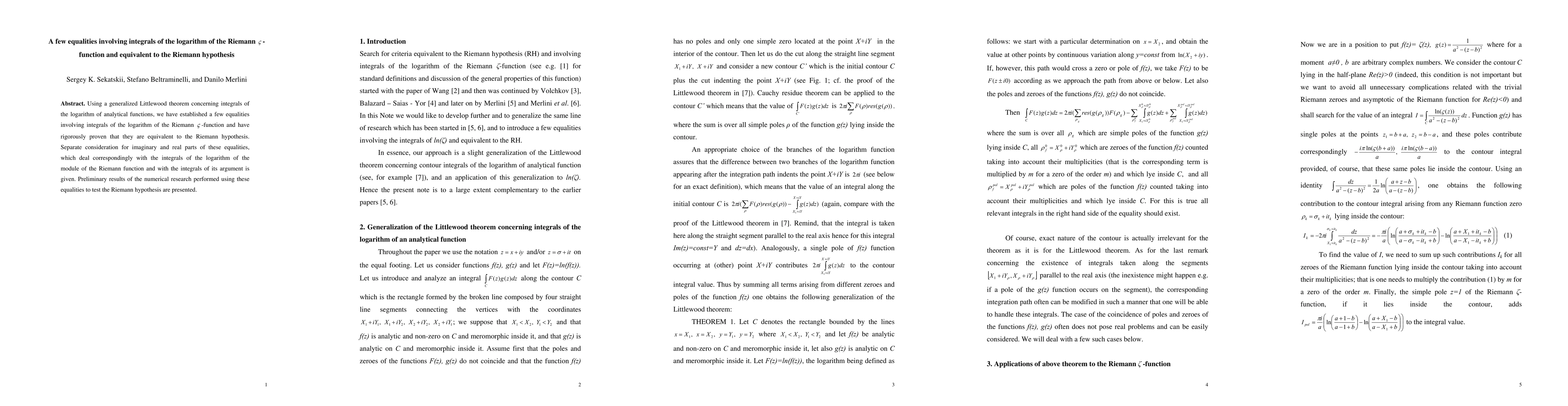 This paper establishes several equalities involving integrals of the logarithm of the Riemann Zeta-function, proving their equivalence to the Riemann hypothesis using a generalized Littlewood theorem. It also presents preliminary numerical results testing the hypothesis using these equalities.