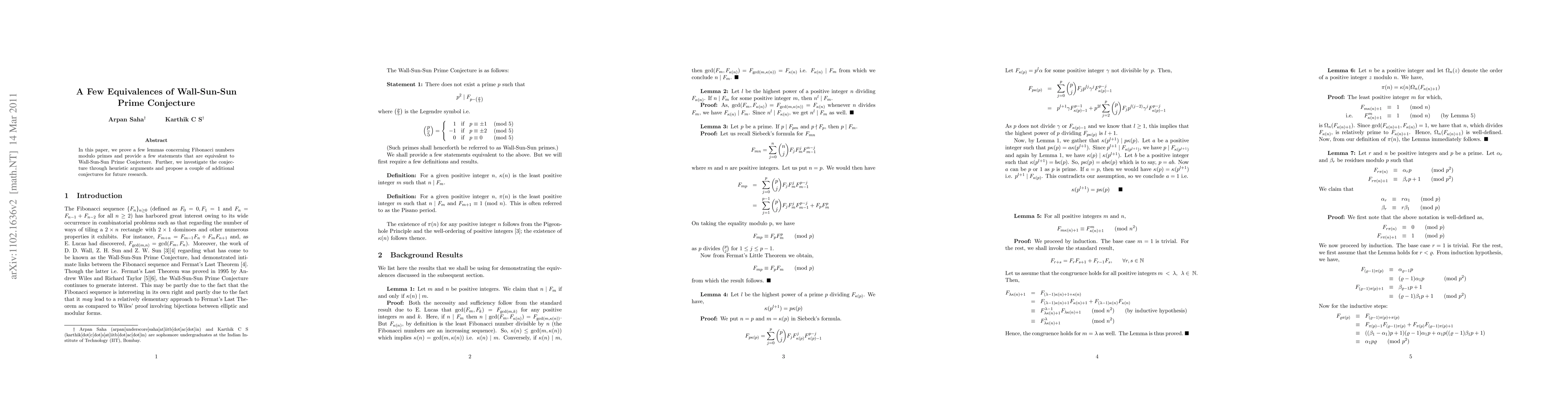 This paper proves lemmas about Fibonacci numbers modulo primes, establishes equivalent statements to the Wall-Sun-Sun Prime Conjecture, and suggests further research conjectures using heuristic arguments.